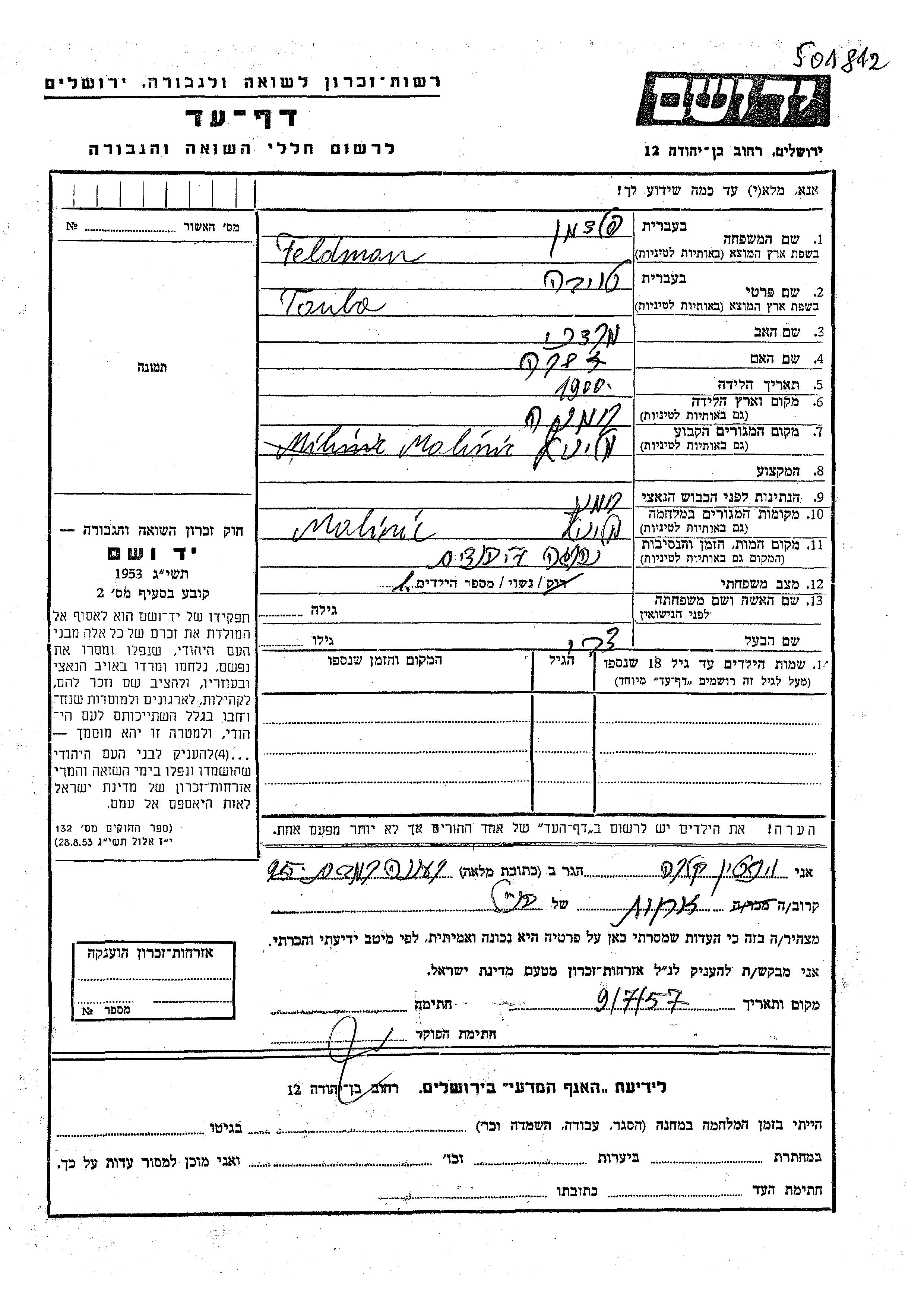 Touba Feldman wurde im Jahr 1900 in Rumänien geboren. Sie war die Tochter von Mordekhai und Sara. Sie war mit Tzvi Verheiratet. Vor dem Zweiten Weltkrieg lebte sie in Malinic, Rumänien. Während des Krieges war sie in Malinic, Rumänien.