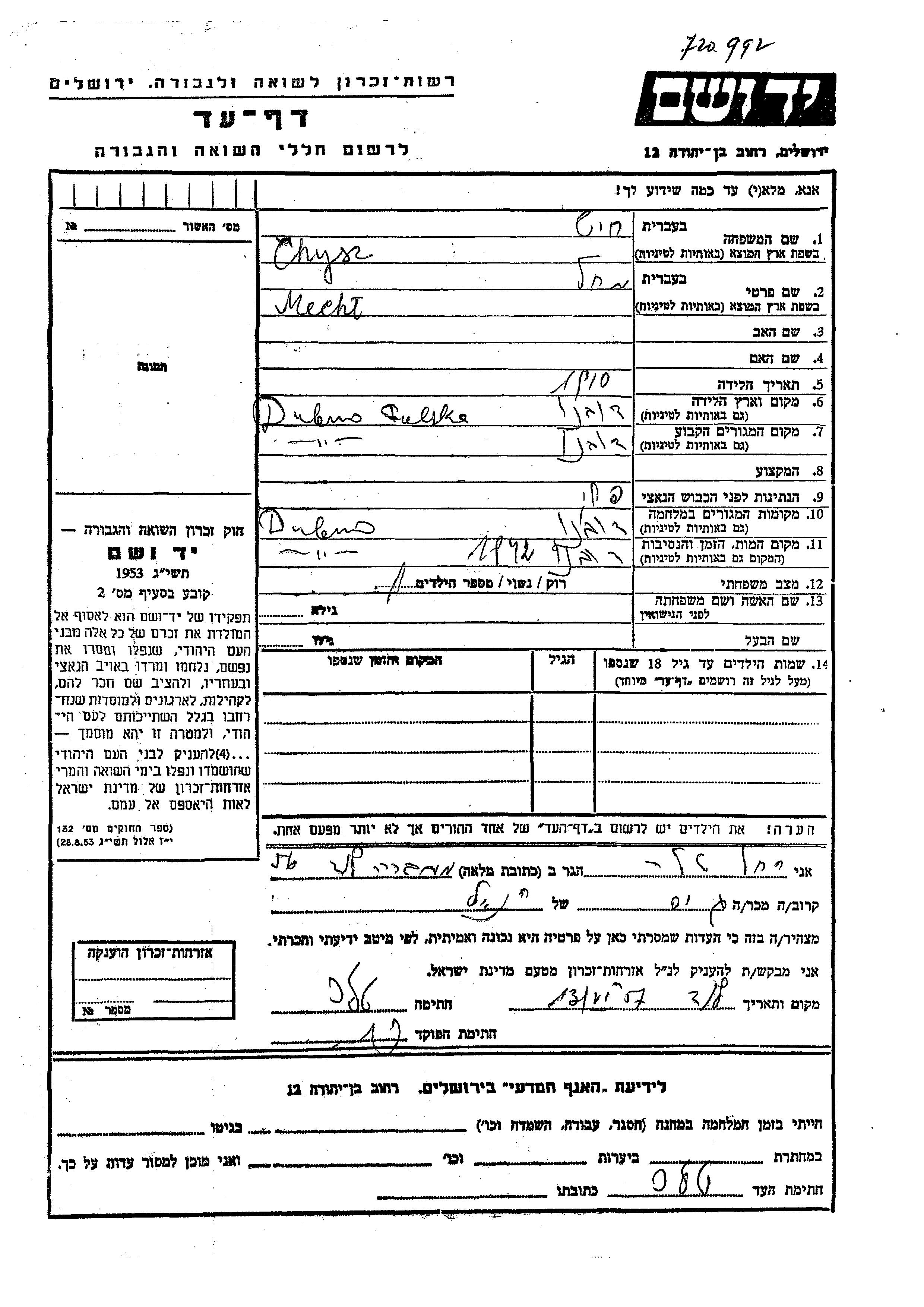 Mechl Chysz wurde im Jahr 1910 in Dubno, Polen geboren. Er war Verheiratet. Vor dem Zweiten Weltkrieg lebte er in Dubno, Polen. Während des Krieges war er in Dubno, Polen.