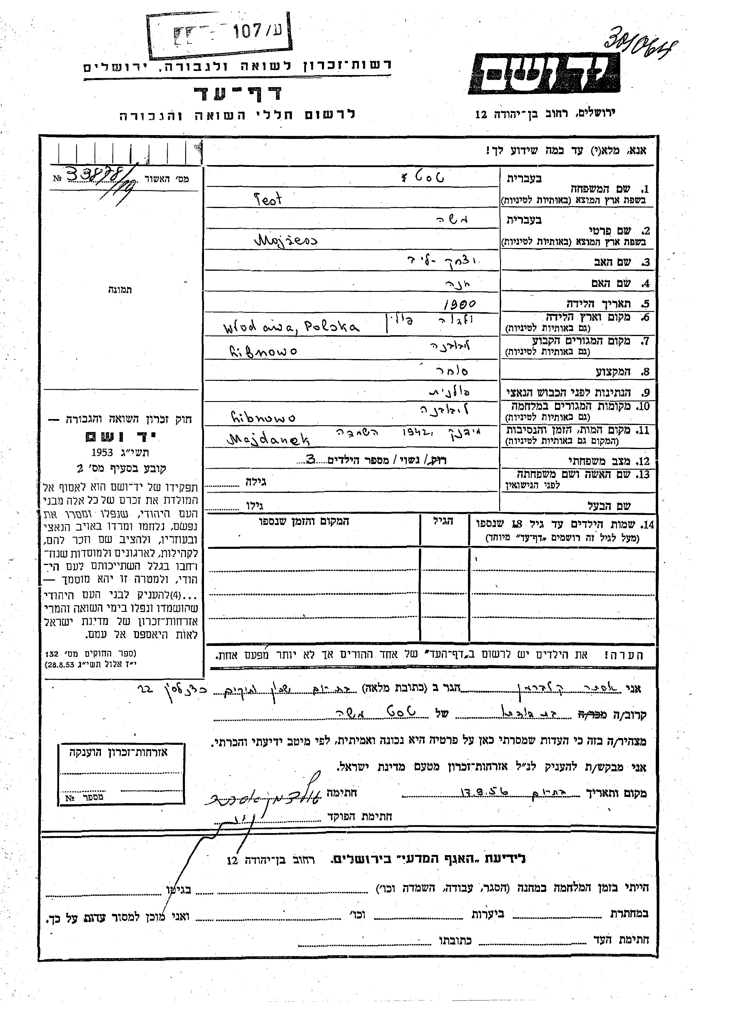 Mojzesz Test wurde im Jahr 1900 in Wlodawa, Polen geboren. Er war der Sohn von Yitzkhak Leib und Khana. Er war Kaufmann/-frau und Verheiratet. Vor dem Zweiten Weltkrieg lebte er in Libowna, Polen. Während des Krieges war er in Libowna, Polen.