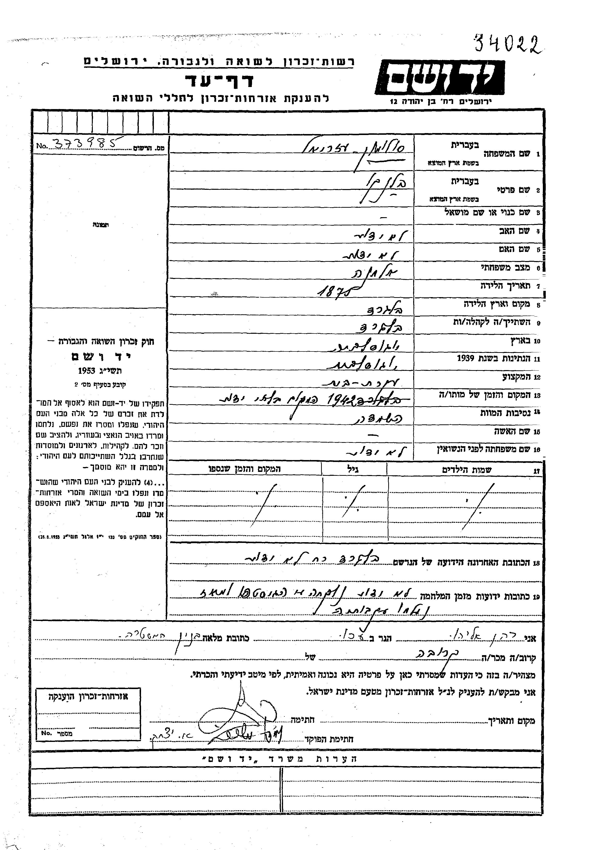 Blanko Solomon Azriel, geb. Azriel wurde im Jahr 1875 in Belgrad, Jugoslawien geboren. Sie war Hausfrau und Witwe. Vor dem Zweiten Weltkrieg lebte sie in Belgrad, Jugoslawien.