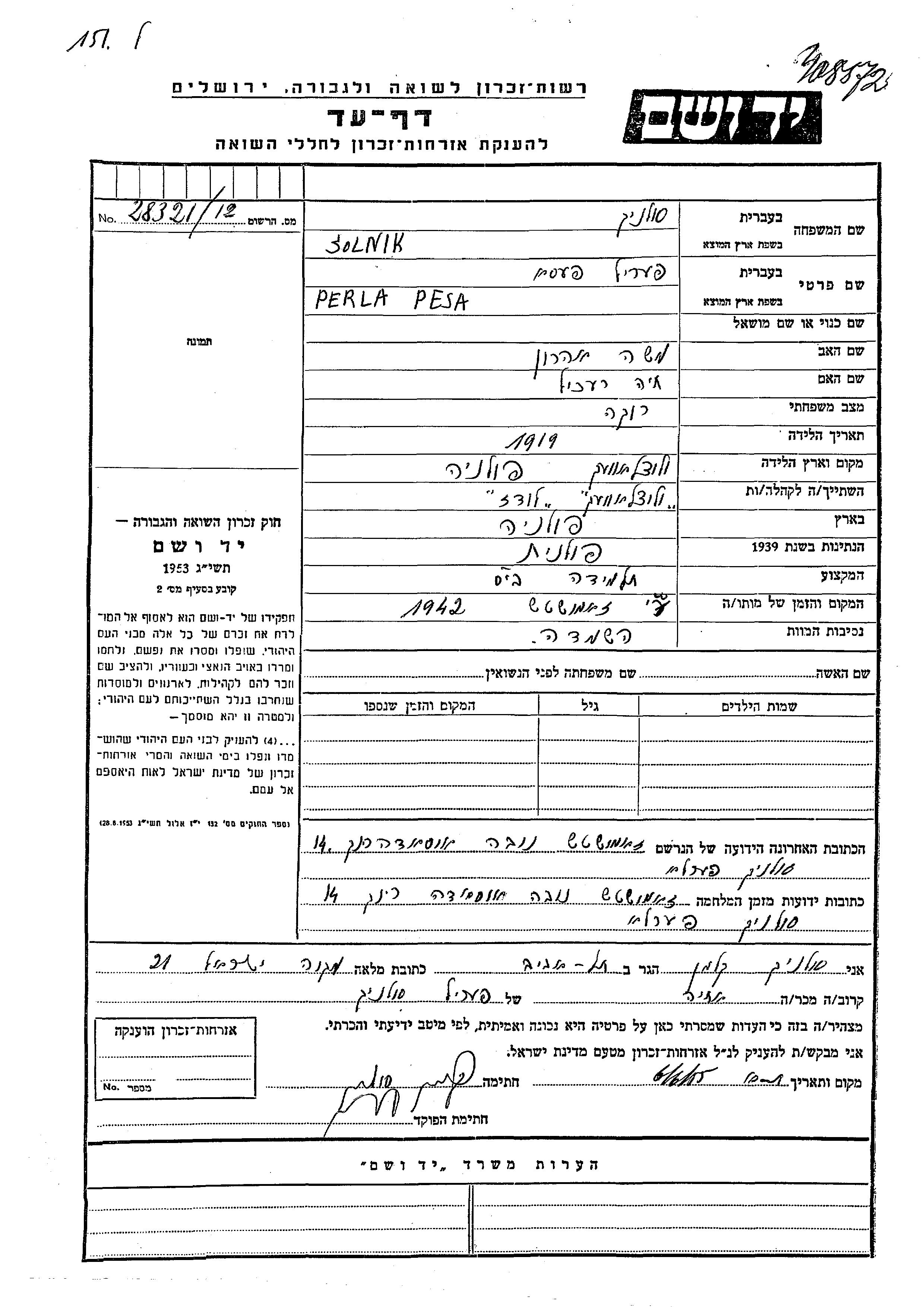 Perla Pesa Solnik wurde im Jahr 1919 geboren. Sie war die Tochter von Moshe Aharon und Khaia Rekhil. Sie war Schüler/-in. Vor dem Zweiten Weltkrieg lebte sie in Lodz, Polen. Während des Krieges war sie in Zamosc, Polen.