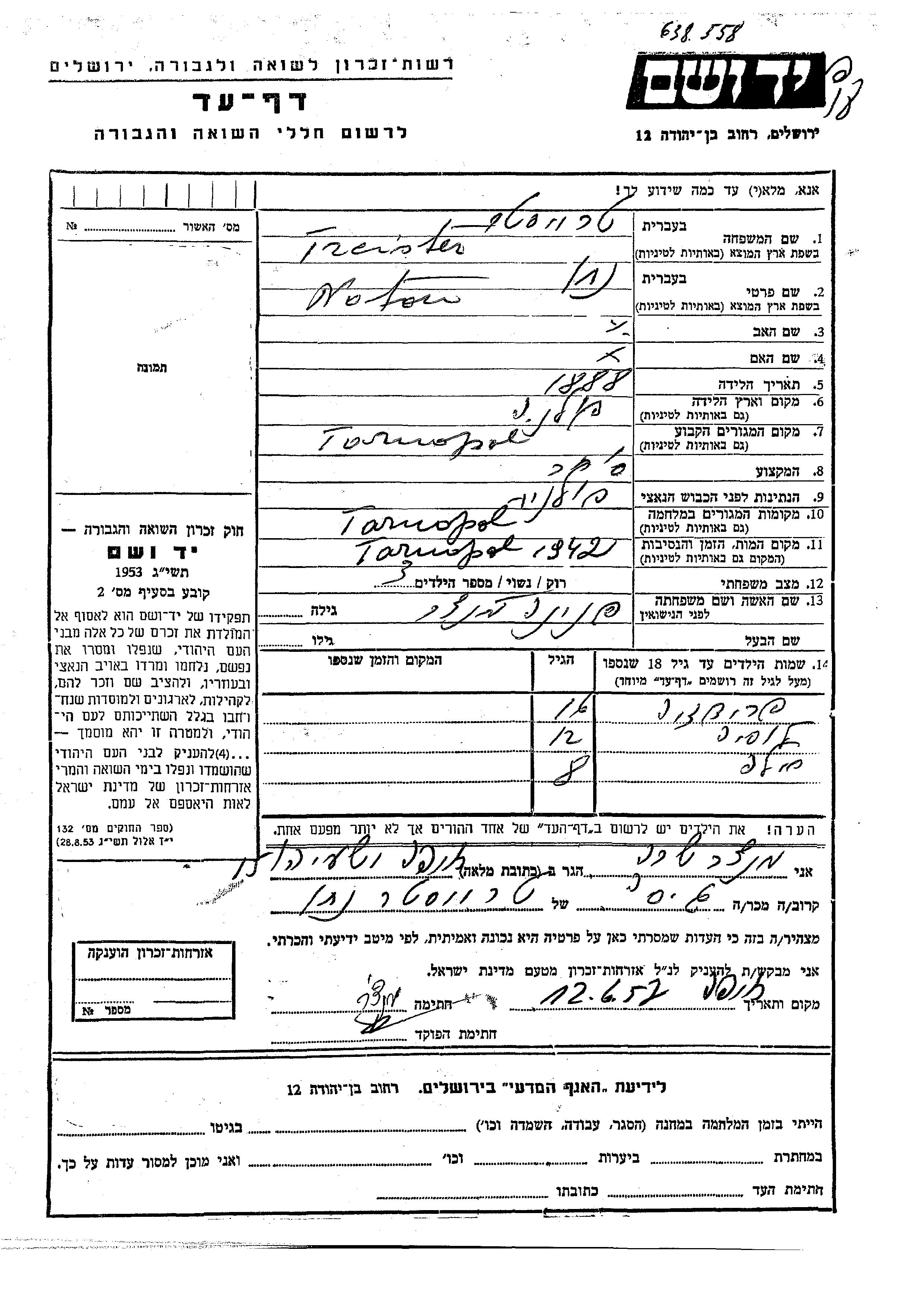 Natan Treister wurde im Jahr 1888 in Polen geboren. Er war Kaufmann/-frau und mit Pnina, geb. Mantzer Verheiratet. Vor dem Zweiten Weltkrieg lebte er in Tarnopol, Polen. Während des Krieges war er in Tarnopol, Polen.