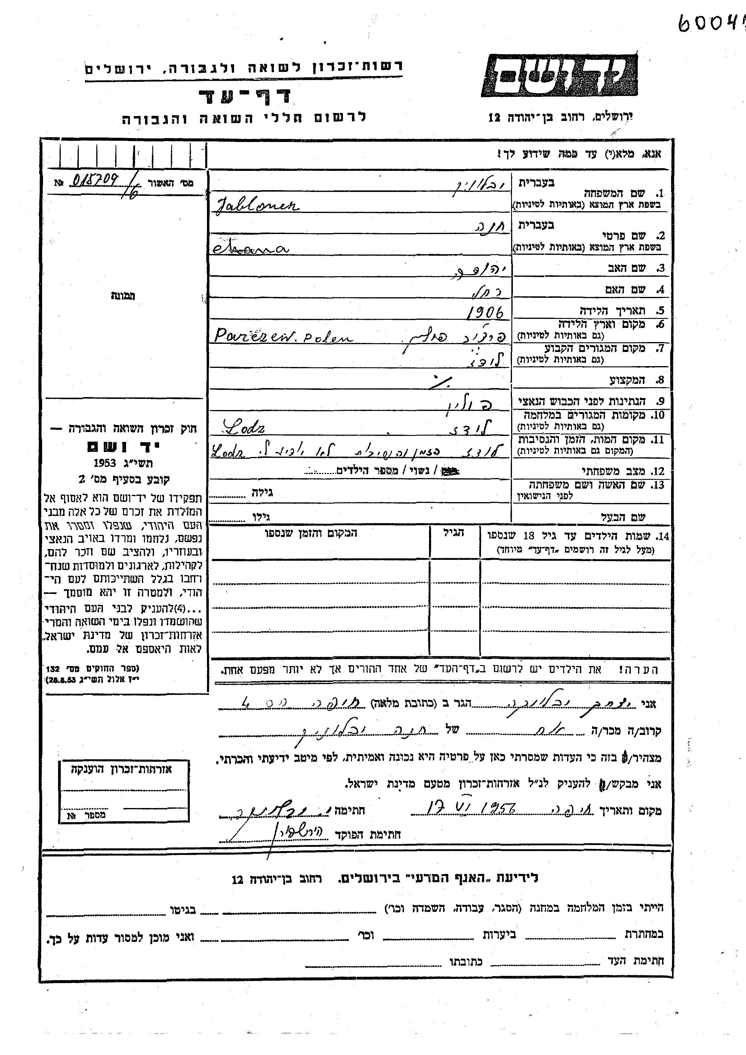 Chana Jablonek wurde im Jahr 1906 in Parczew, Polen geboren. Sie war die Tochter von Yehuda und Rakhel. Sie war Verheiratet. Vor dem Zweiten Weltkrieg lebte sie in Lodz, Polen. Während des Krieges war sie in Lodz, Polen.