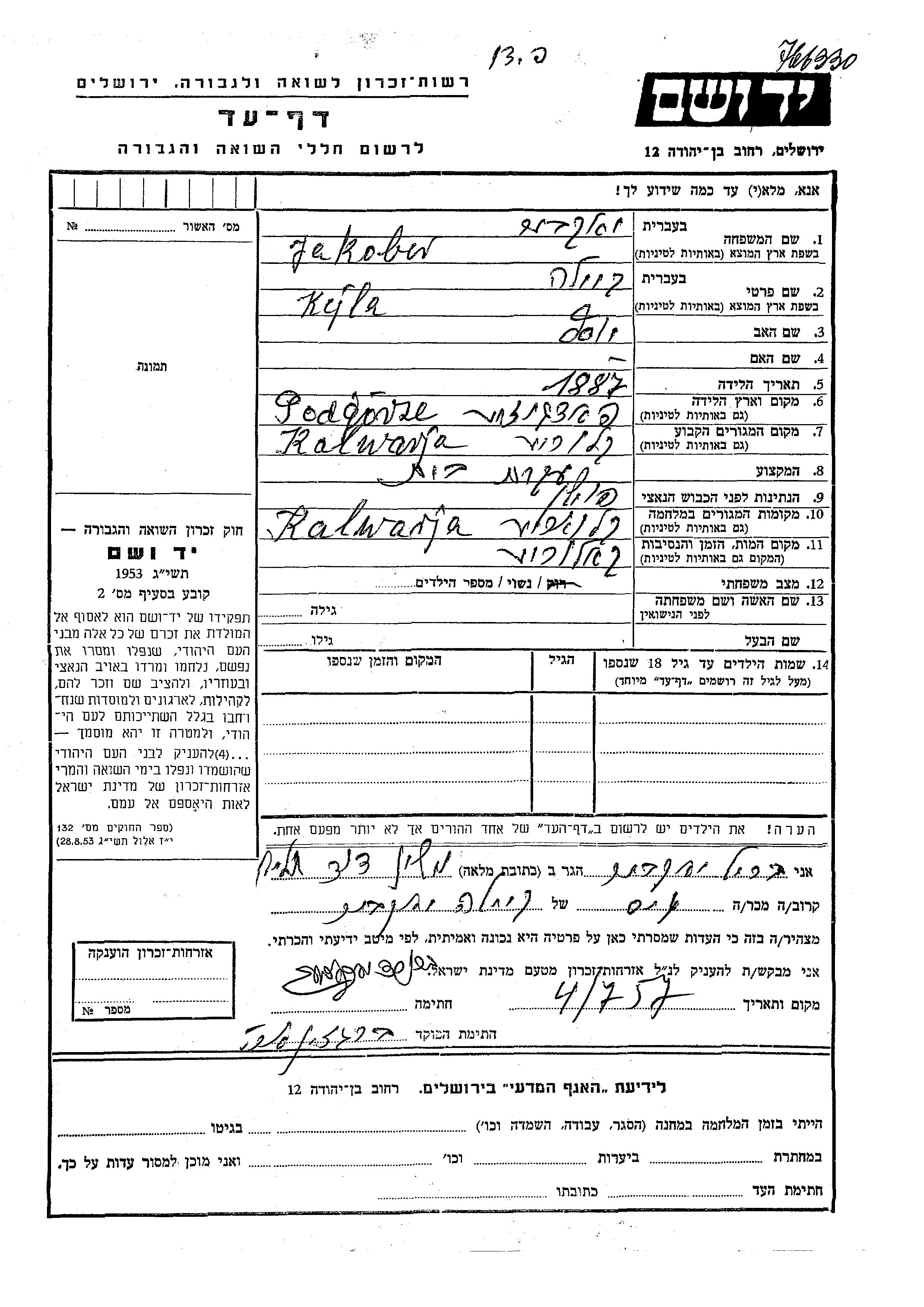 Kejla wurde in der Schoah ermordet. Todesort: Kalwarja Zebrzydowska, Polen.