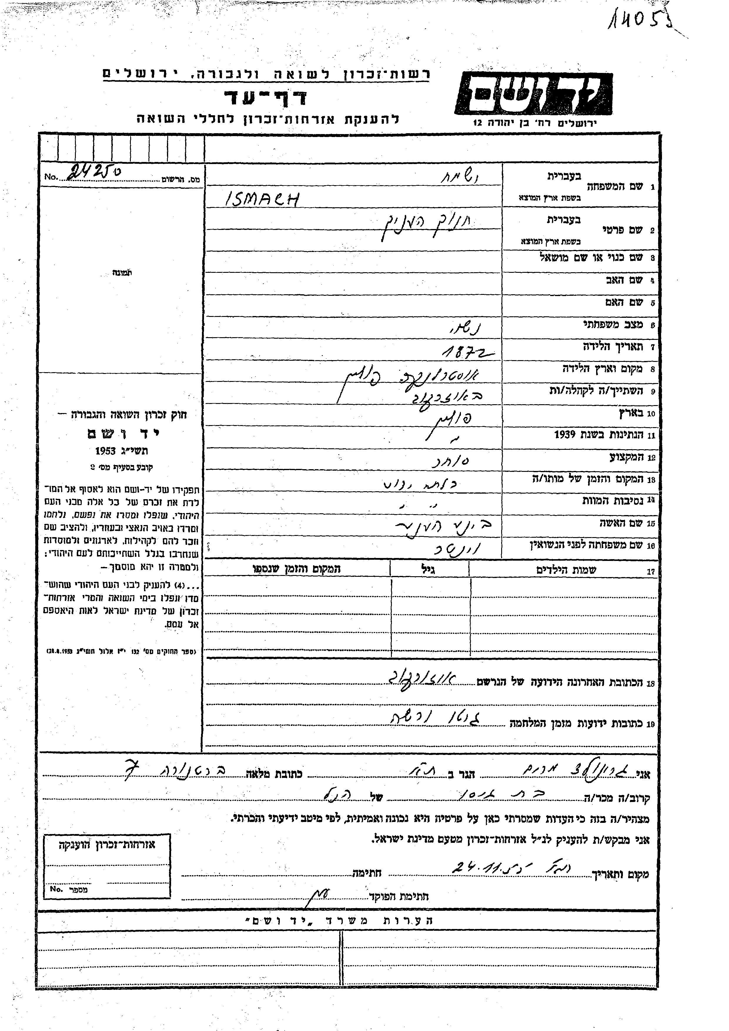 Khanokh Honikh Ismach wurde im Jahr 1872 in Ostroleka, Polen geboren. Er war Kaufmann/-frau. Vor dem Zweiten Weltkrieg lebte er in Ostroleka, Polen. Während des Krieges war er in Warsaw, Polen.