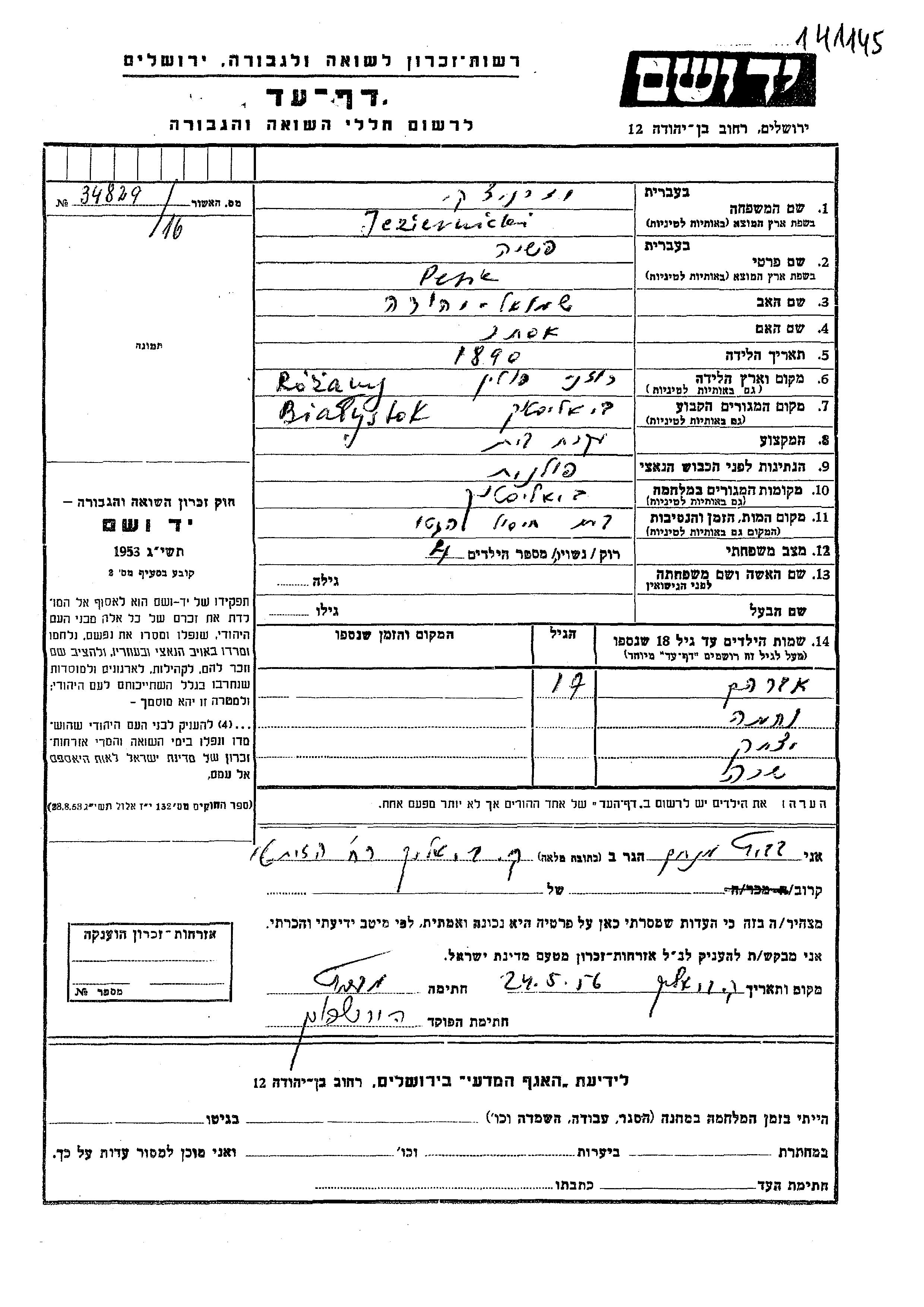 Pesha Jeziernicki wurde im Jahr 1890 in Rozany, Polen geboren. Sie war die Tochter von Shmuel Yehuda und Ester. Sie war Hausfrau und Verheiratet. Vor dem Zweiten Weltkrieg lebte sie in Bialistok, Polen. Während des Krieges war sie in Bialistok, Polen.