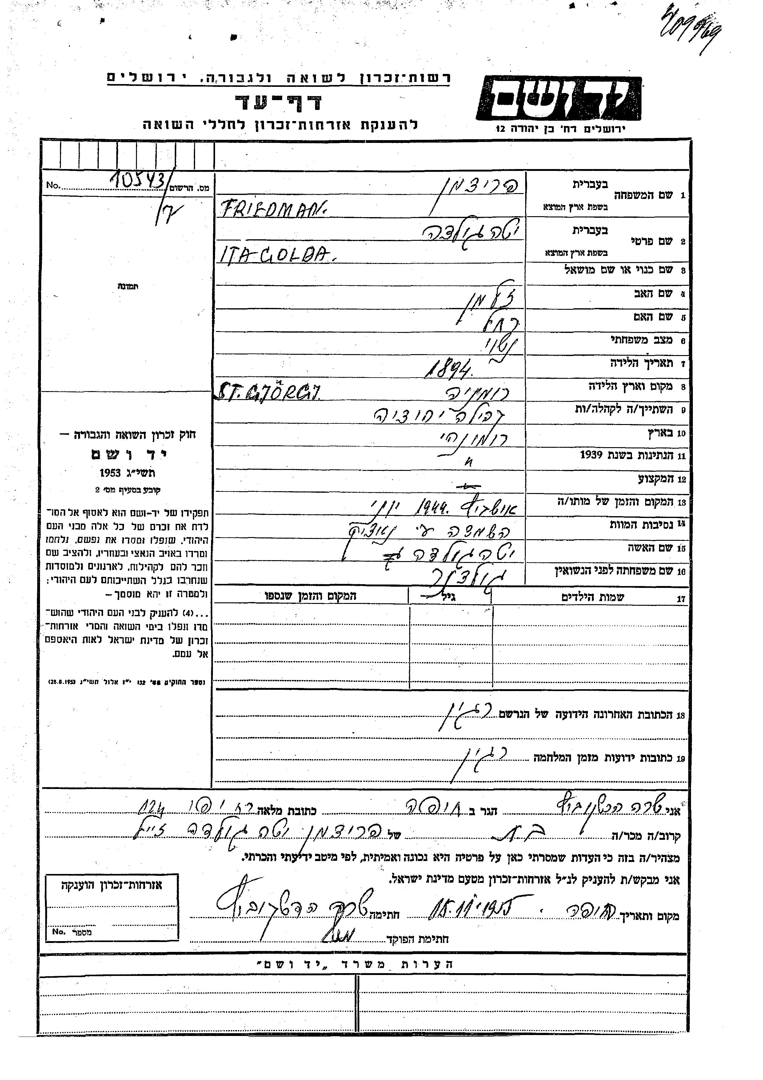 Ita Golda Friedman, geb. Goldner wurde im Jahr 1894 in Sfantul Gheorghe, Rumänien geboren. Sie war die Tochter von Zalman und Rakhel. Vor dem Zweiten Weltkrieg lebte sie in Reghin, Rumänien. Während des Krieges war sie in Reghin, Rumänien.