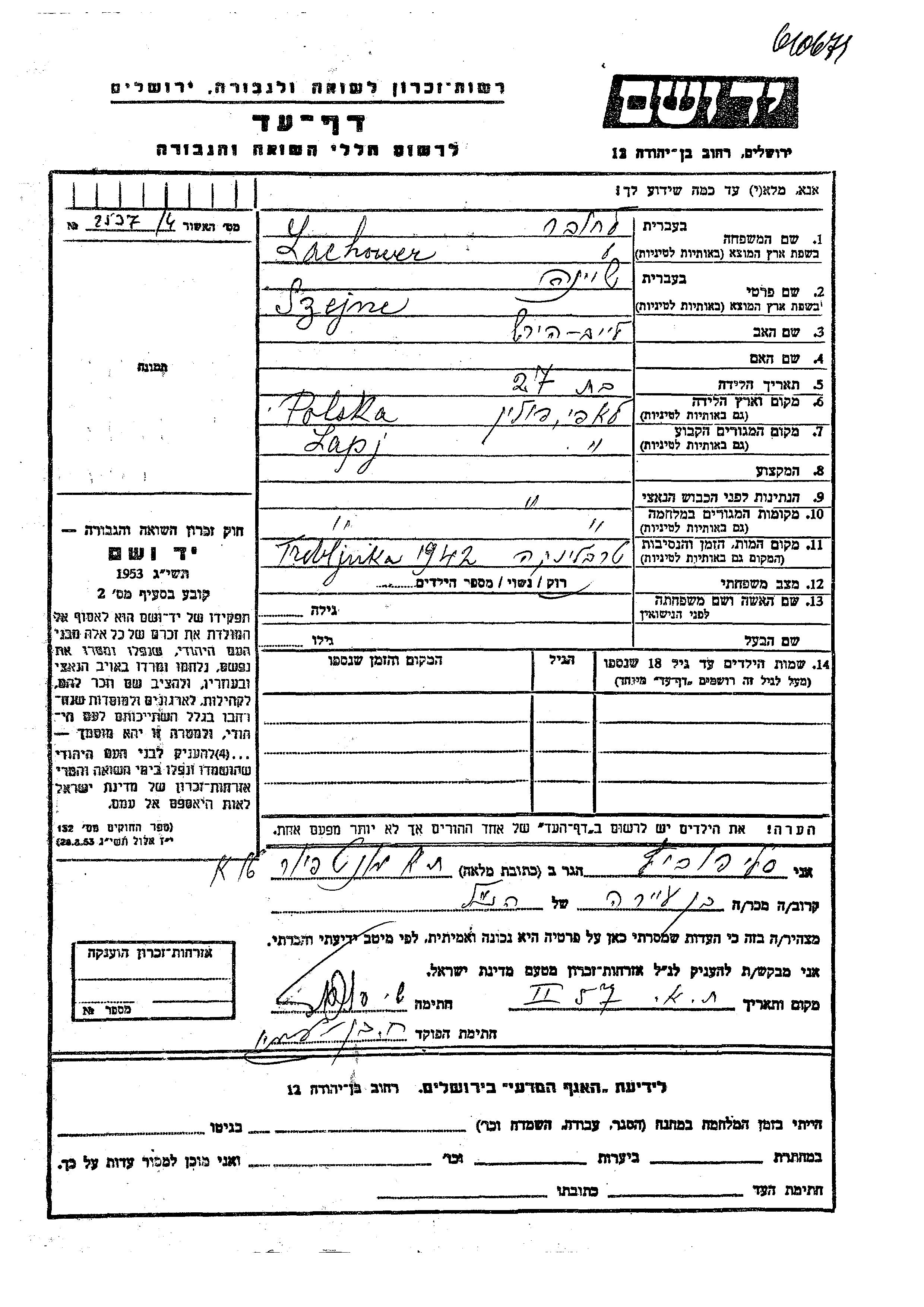 Szejna wurde in der Schoah ermordet. Todesort: Treblinka, Polen im Jahr 1942.