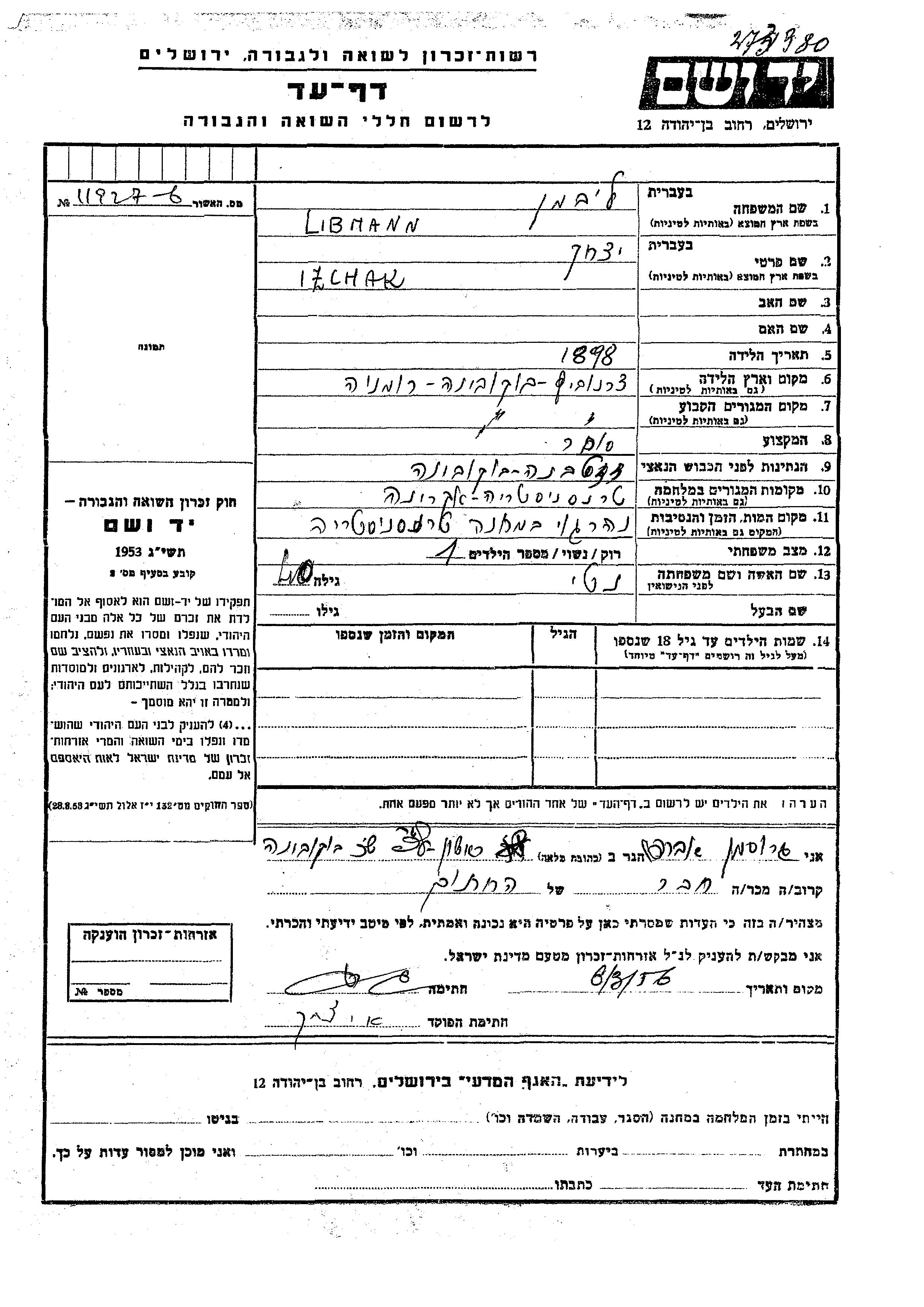 Izchak Libmann wurde im Jahr 1898 in Czernowitz, Rumänien geboren. Er war Kaufmann/-frau und mit Neti Verheiratet. Vor dem Zweiten Weltkrieg lebte er in Czernowitz, Rumänien. Während des Krieges war er in Transnistria, Ukraine (UdSSR).