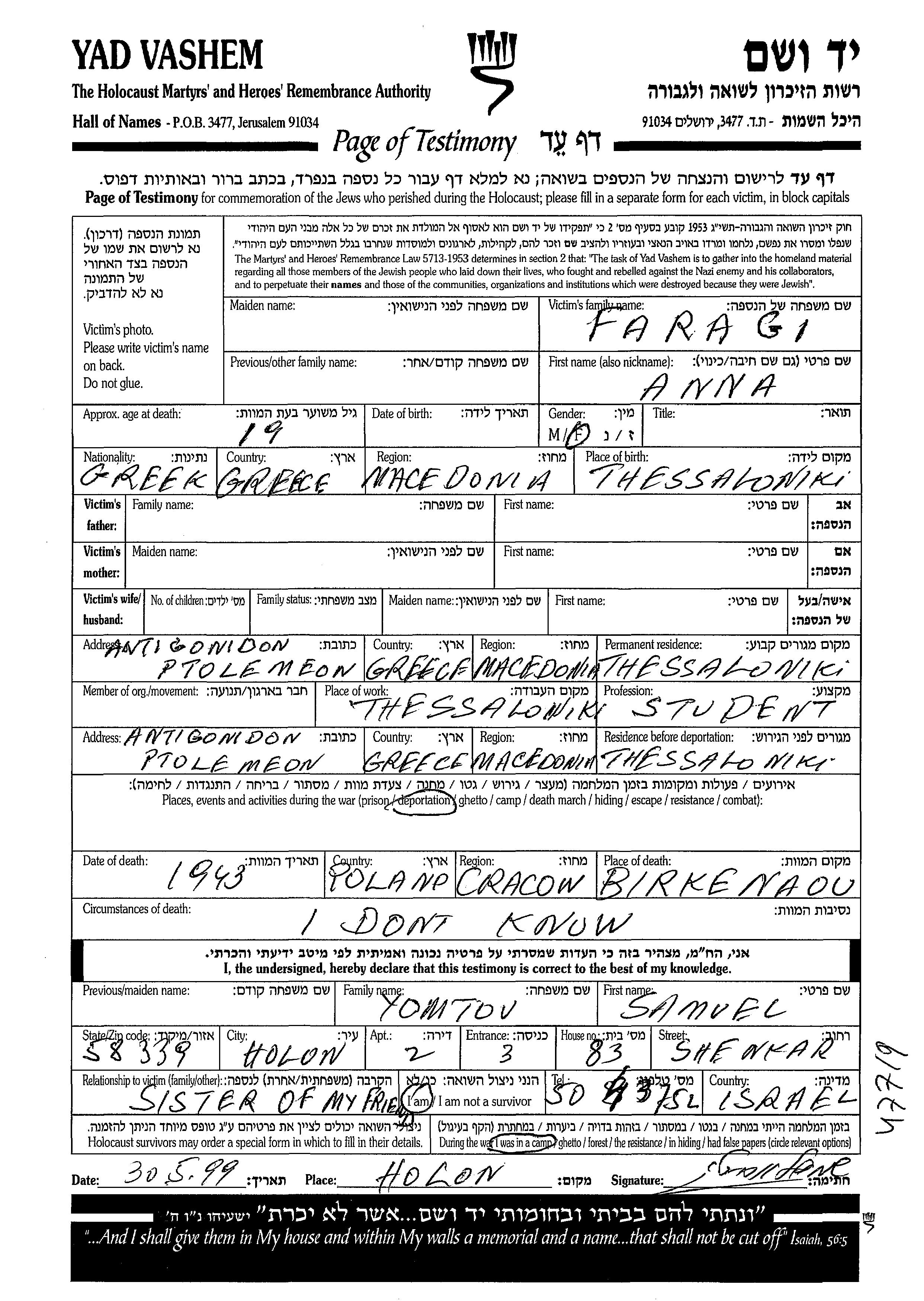 Anna Faragi wurde in Thessaloniki, Griechenland geboren. Sie war Student. Vor dem Zweiten Weltkrieg lebte sie in Thessaloniki, Griechenland. Während des Krieges war sie in Thessaloniki, Griechenland.