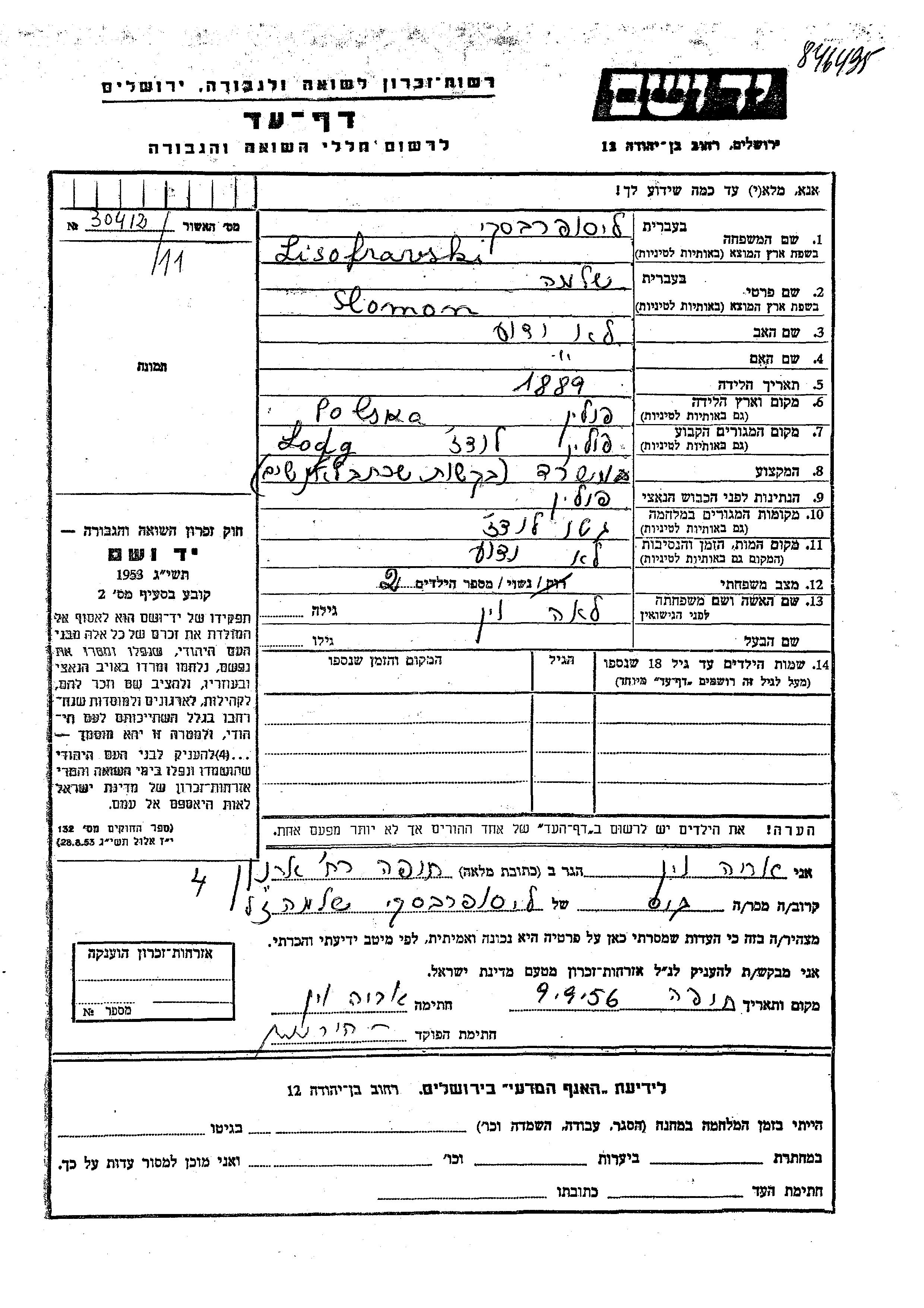 Slomon Lisoprawski wurde im Jahr 1889 in Polen geboren. Er war Angestellte/-r und mit Lea, geb. Vin Verheiratet. Vor dem Zweiten Weltkrieg lebte er in Lodz, Polen. Während des Krieges war er in Lodz, Polen.