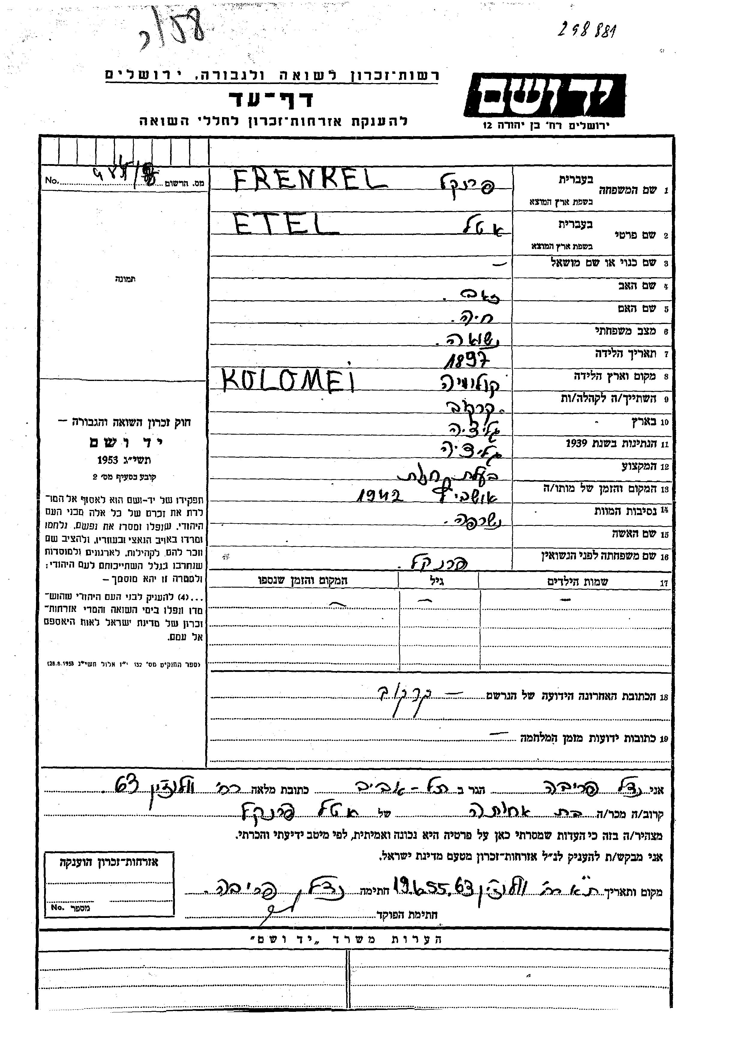 Etel Frenkel, geb. Frenkel wurde im Jahr 1897 in Kolomyja, Polen geboren. Sie war die Tochter von Zeev und Khaia. Sie war Ladenbesitzer/-in und Verheiratet. Vor dem Zweiten Weltkrieg lebte sie in Krakow, Polen. Während des Krieges war sie in Krakow, Polen.