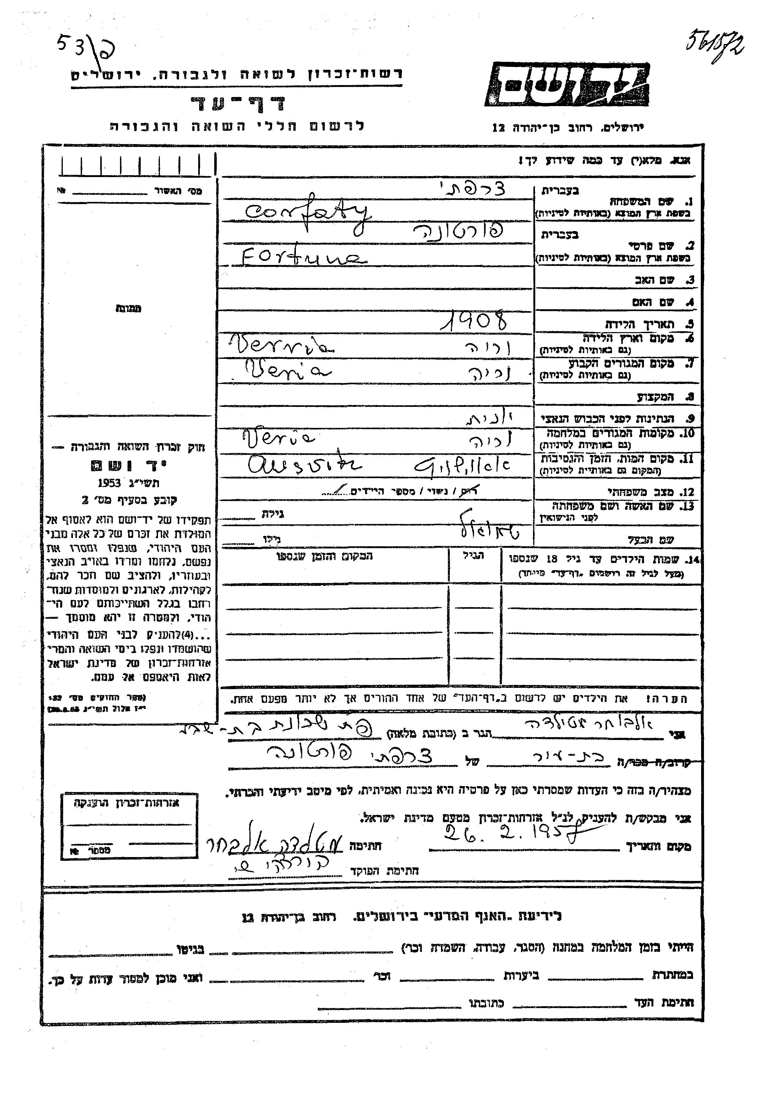Fortuna wurde in der Schoah ermordet. Todesort: Auschwitz, Polen.
