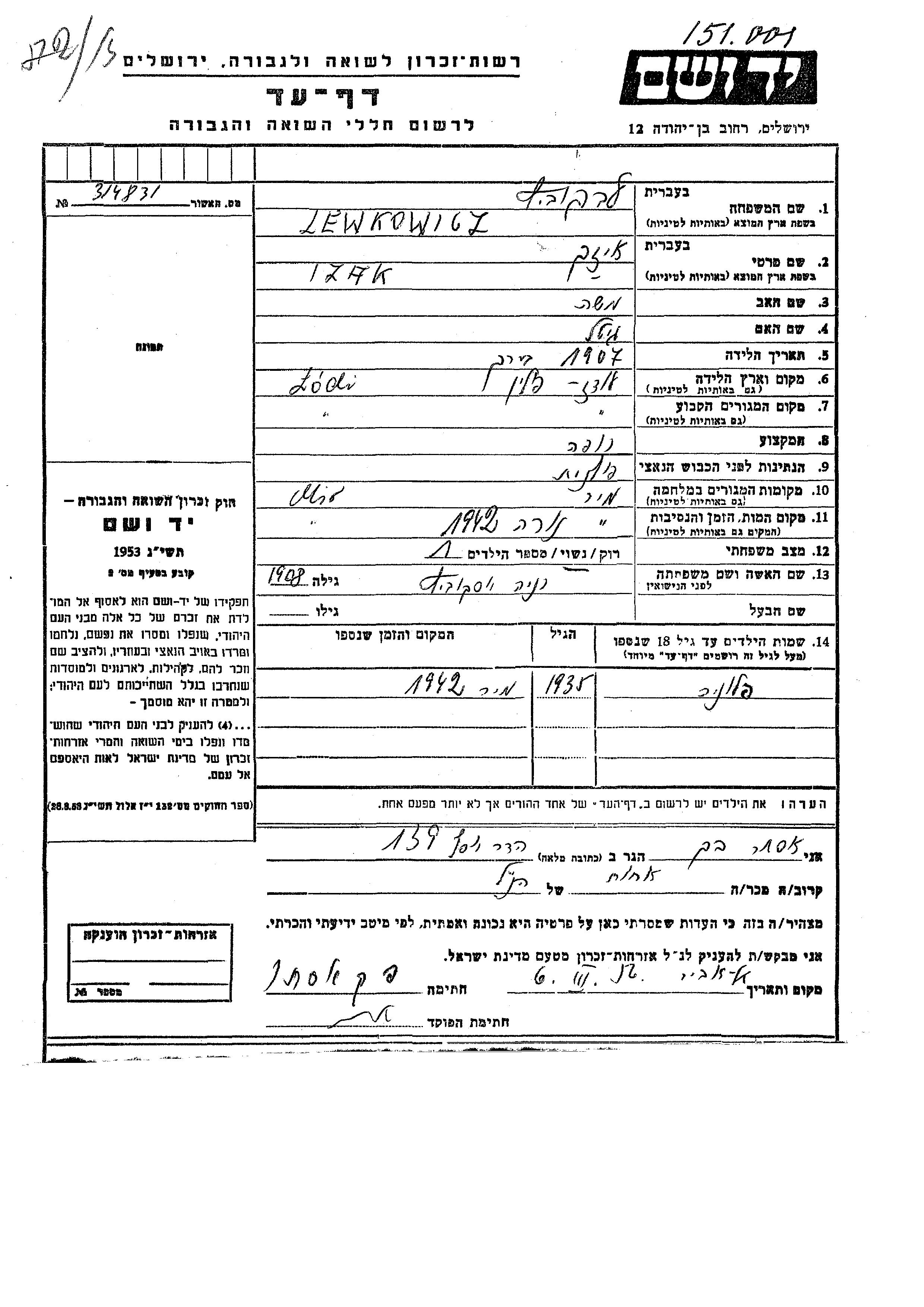 Lewkowicz Izak 1907 Lodz, Polen Gedenkblatt