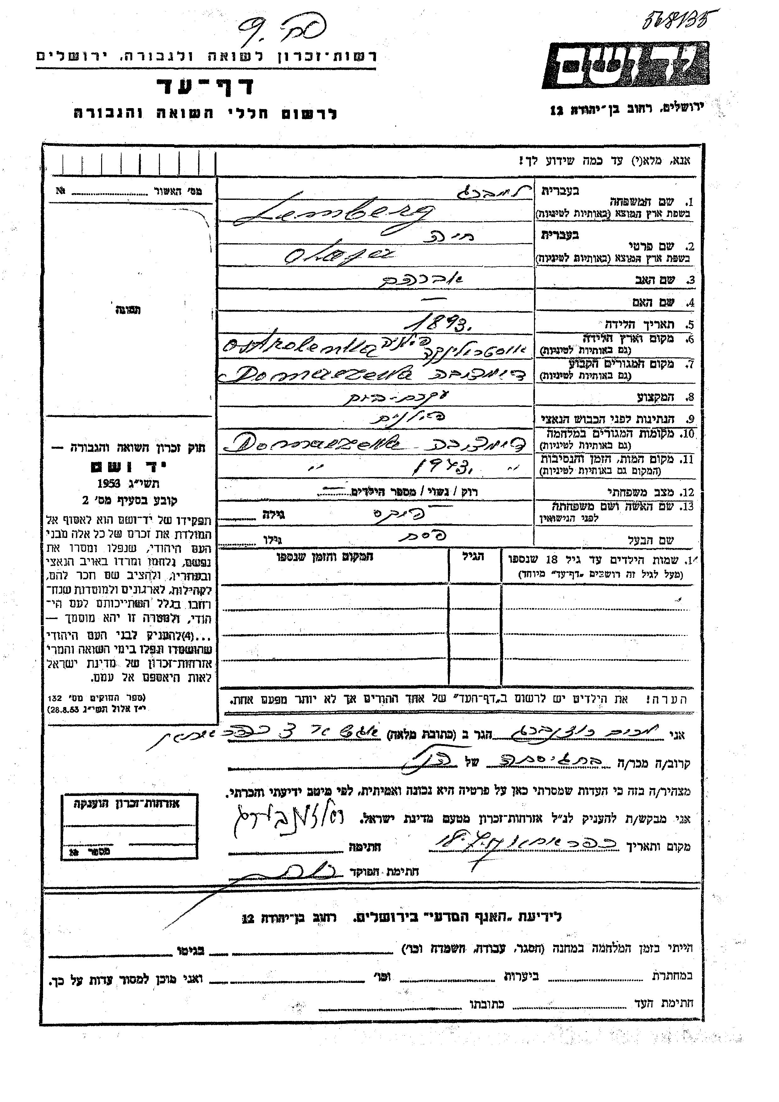 Chaja Lemberg, geb. Fuks wurde im Jahr 1893 in Ostrolenka, Polen geboren. Sie war die Tochter von Avraham. Sie war Hausfrau und mit Pesakh Verheiratet. Vor dem Zweiten Weltkrieg lebte sie in Domaczewa, Polen. Während des Krieges war sie in Domaczewa, Polen.