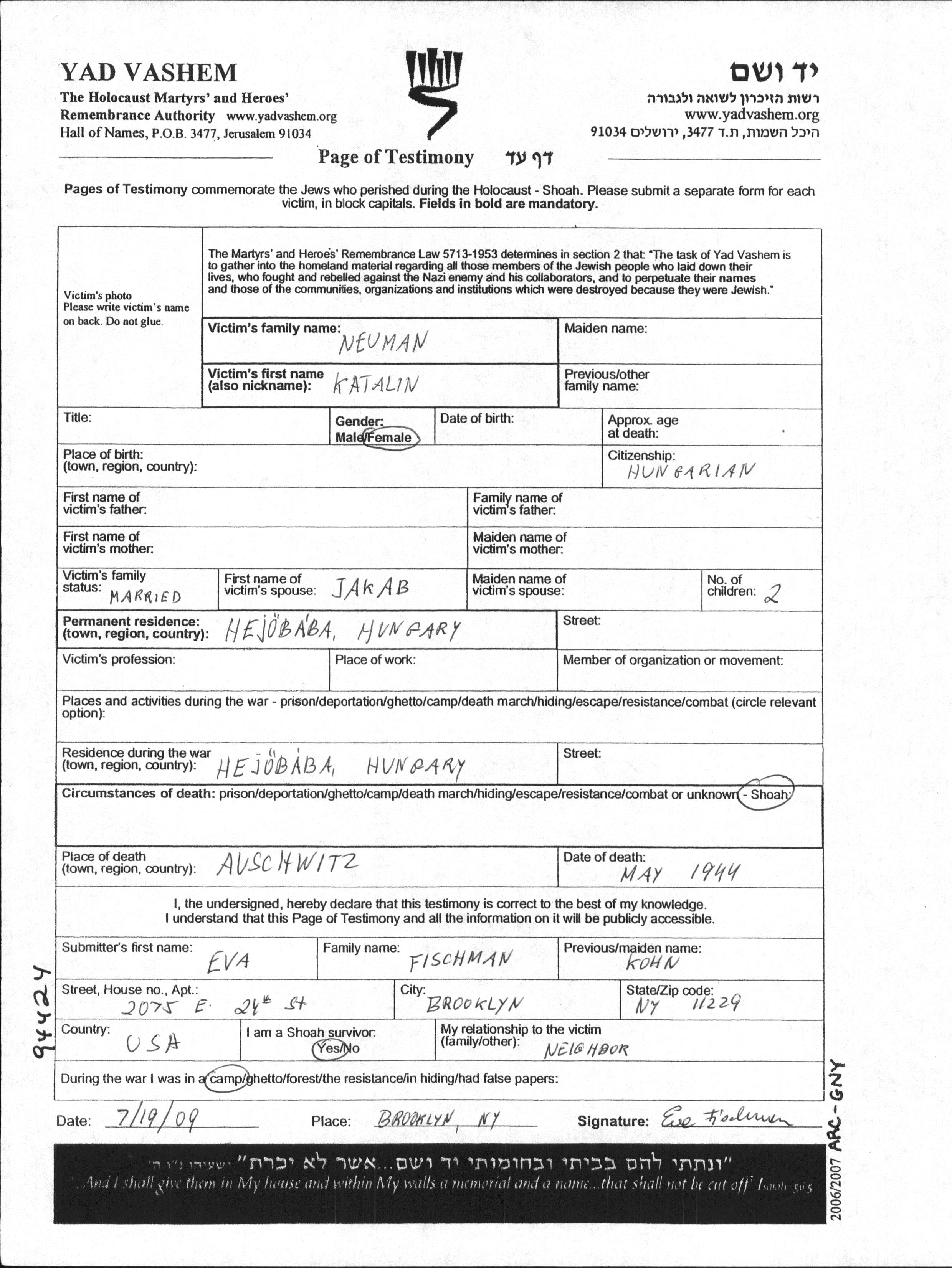 Katalin Neuman wurde in Ungarn geboren. Sie war mit Jakab Verheiratet. Vor dem Zweiten Weltkrieg lebte sie in Hejobaba, Ungarn. Während des Krieges war sie in Hejobaba, Ungarn.