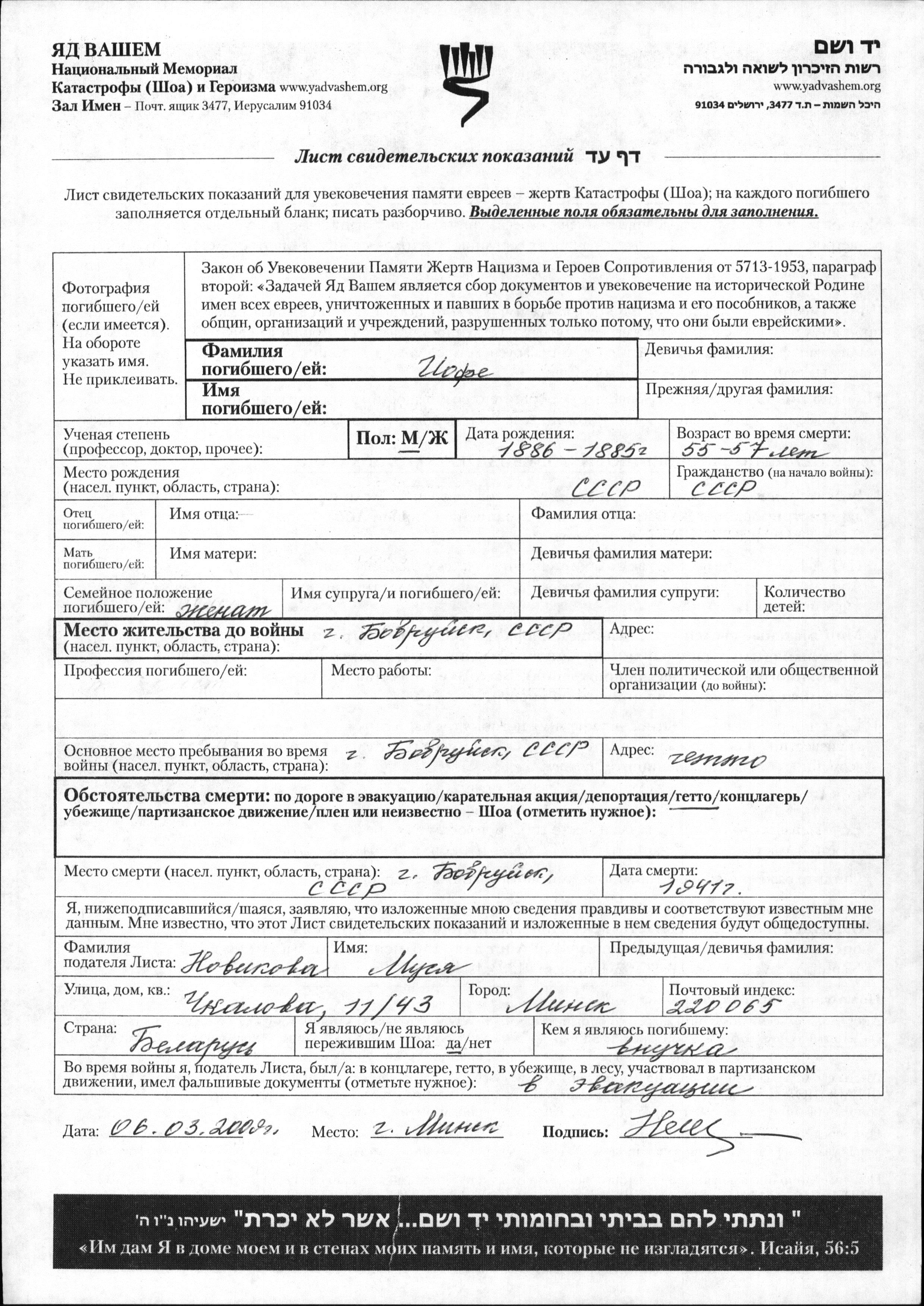 Vorname unbekannt Iofe wurde im Jahr 1886 geboren. Er war Verheiratet. Vor dem Zweiten Weltkrieg lebte er in Bobruysk, Weißrussland (UdSSR). Während des Krieges war er in Bobruysk, Weißrussland (UdSSR).