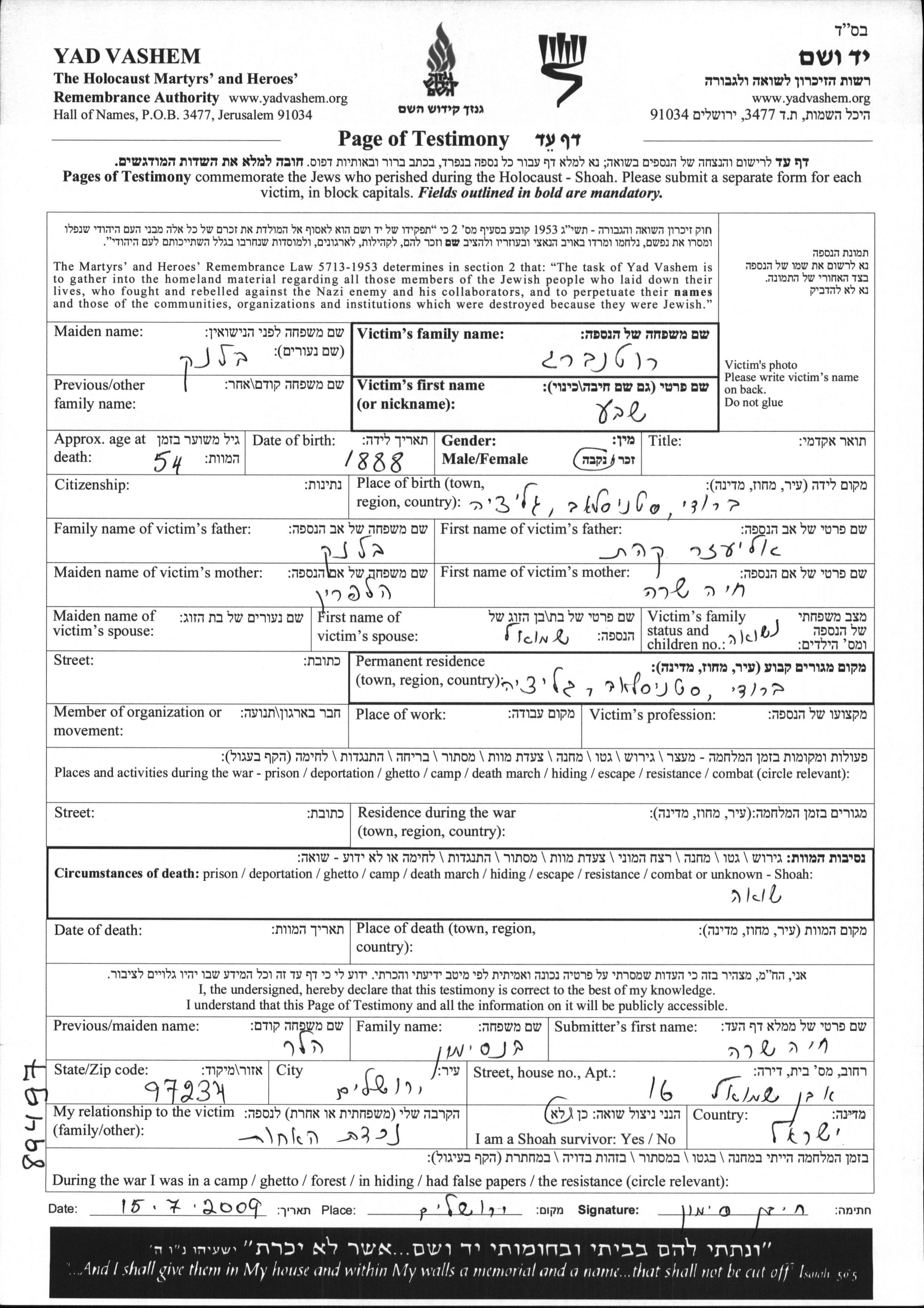 Sheva Rotenberg, geb. Blank wurde im Jahr 1888 in Brody, Polen geboren. Sie war die Tochter von Eliezer Kahat und Chaia Sara, geb. Halperin. Sie war mit Shmuel Verheiratet. Vor dem Zweiten Weltkrieg lebte sie in Brody, Polen.