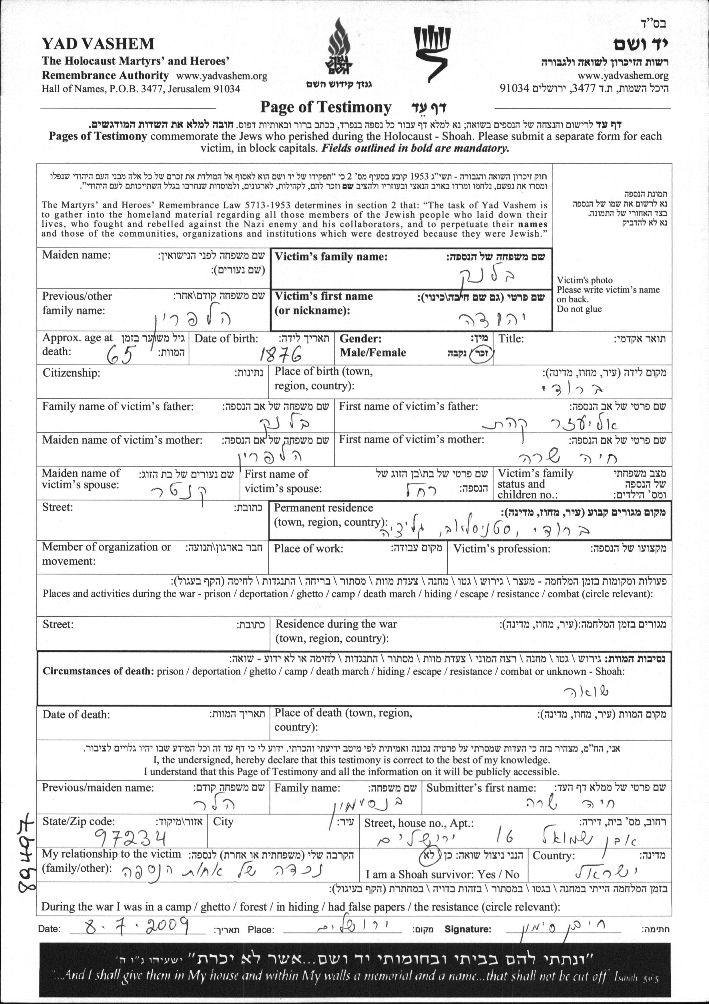 Yehuda Blank wurde im Jahr 1876 in Brody, Polen geboren. Er war der Sohn von Eliezer Kahat und Chaia Sara, geb. Halperin. Er war mit Rakhel, geb. Kanter Verheiratet. Vor dem Zweiten Weltkrieg lebte er in Brody, Polen.
