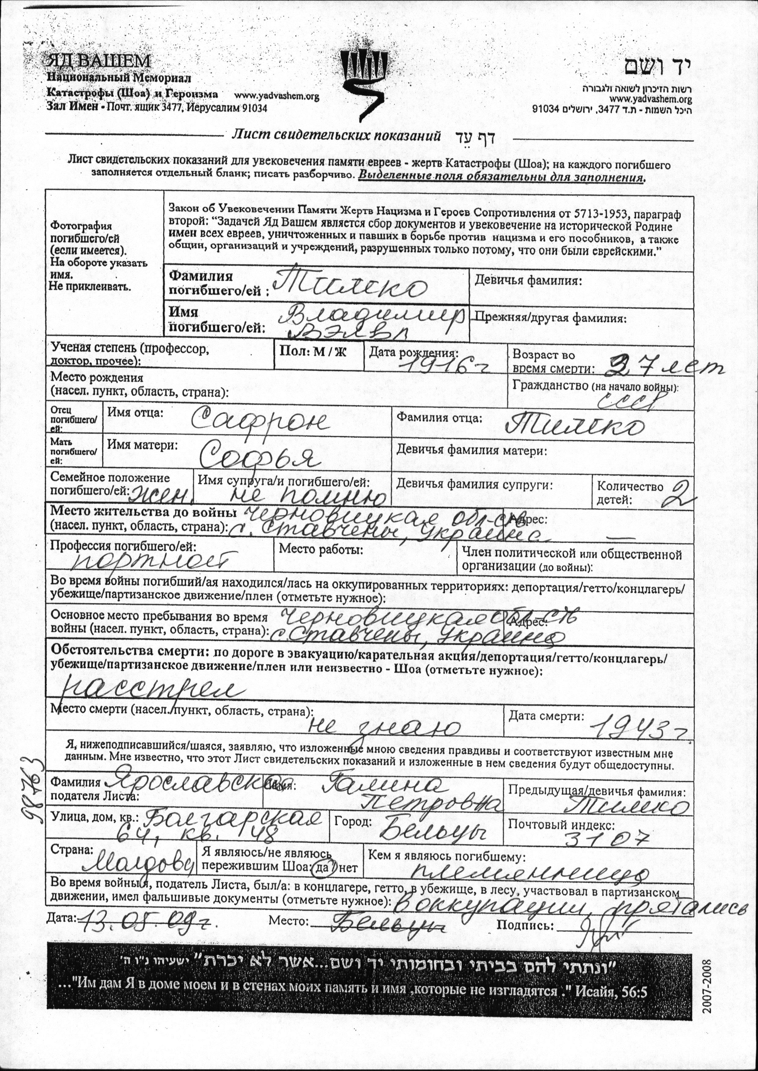 Suche nach einem Todesjahr im Zeitraum der Holocaust: 1933 bis 1945. Bitte wählen Sie 'Exakt' im Auswahlmenü, um nur nach einem einzelnen Jahr zu suchen, alternativ können Sie die flexibleren Optionen '+/- 2 Jahre' oder '+/- 5 Jahre' wählen.