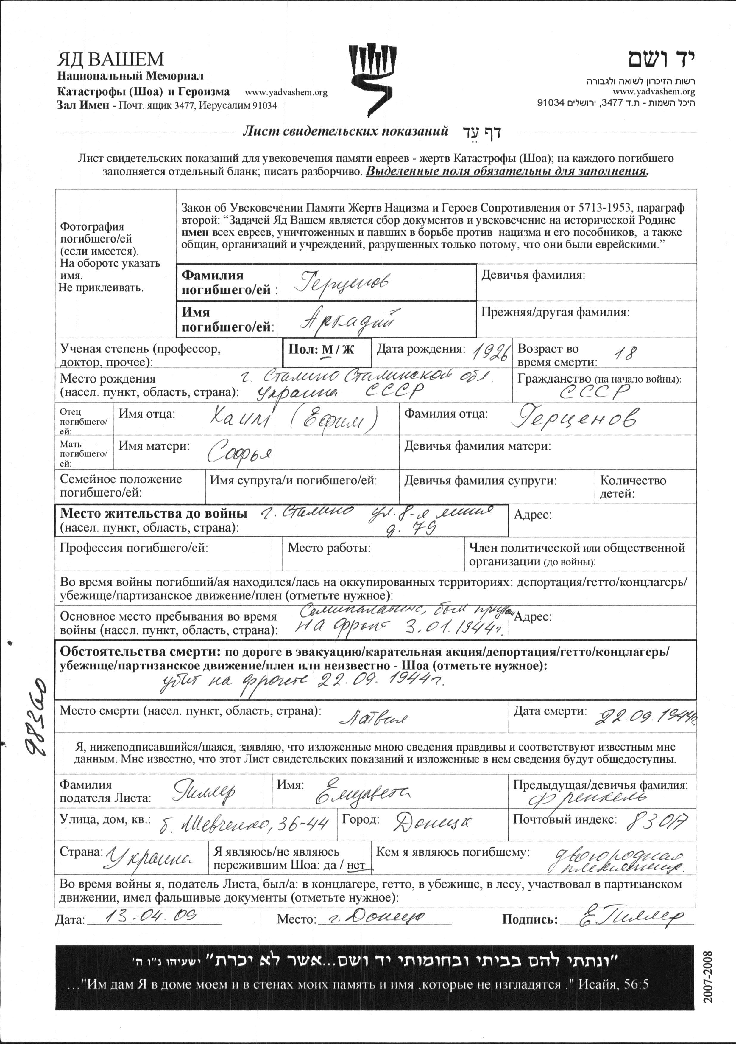 Arkadi Gertzenov wurde im Jahr 1926 in Stalino, Ukraine (UdSSR) geboren. Er war der Sohn von Khaim Yefim und Sofya. Er war Jugendliche/-r. Vor dem Zweiten Weltkrieg lebte er in Stalino, Ukraine (UdSSR). Während des Krieges war er in die Sowjetischen Streitkräfte.