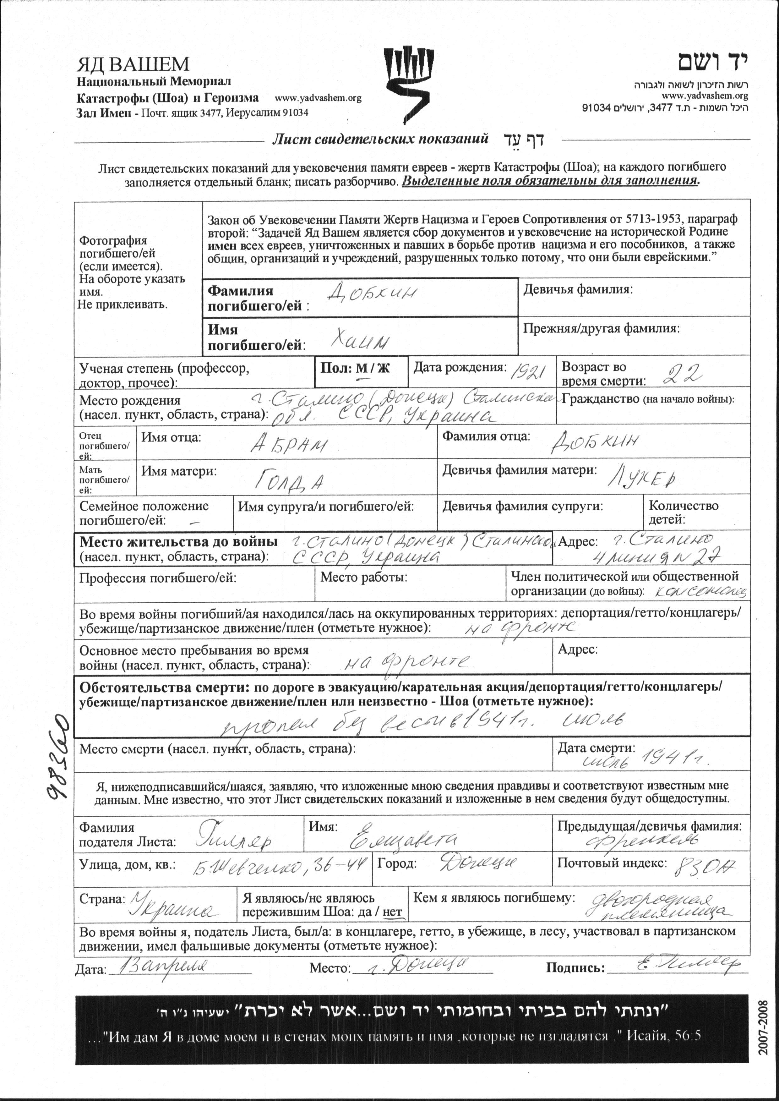Khaim Dobkin wurde in Stalino, Ukraine (UdSSR) geboren. Er war der Sohn von Abram und Golda, geb. Luker. Vor dem Zweiten Weltkrieg lebte er in Stalino, Ukraine (UdSSR). Während des Krieges war er in die Sowjetischen Streitkräfte.