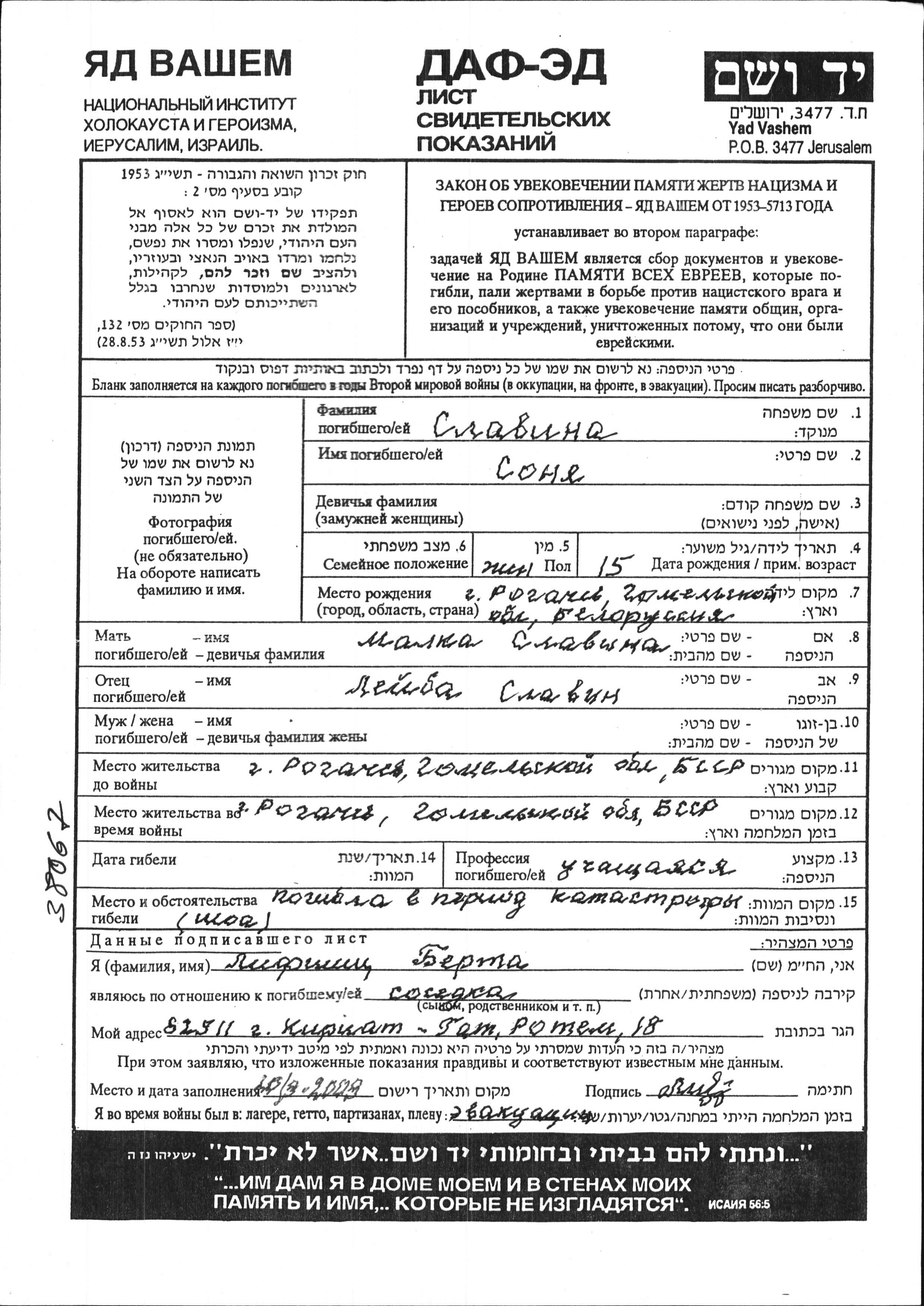 Sonya Slavina wurde in Rogachev, Weißrussland (UdSSR) geboren. Sie war die Tochter von Leyba und Malka. Sie war Uchashchayasya und Jugendliche/-r. Vor dem Zweiten Weltkrieg lebte sie in Rogachev, Weißrussland (UdSSR). Während des Krieges war sie in Rogachev, Weißrussland (UdSSR).