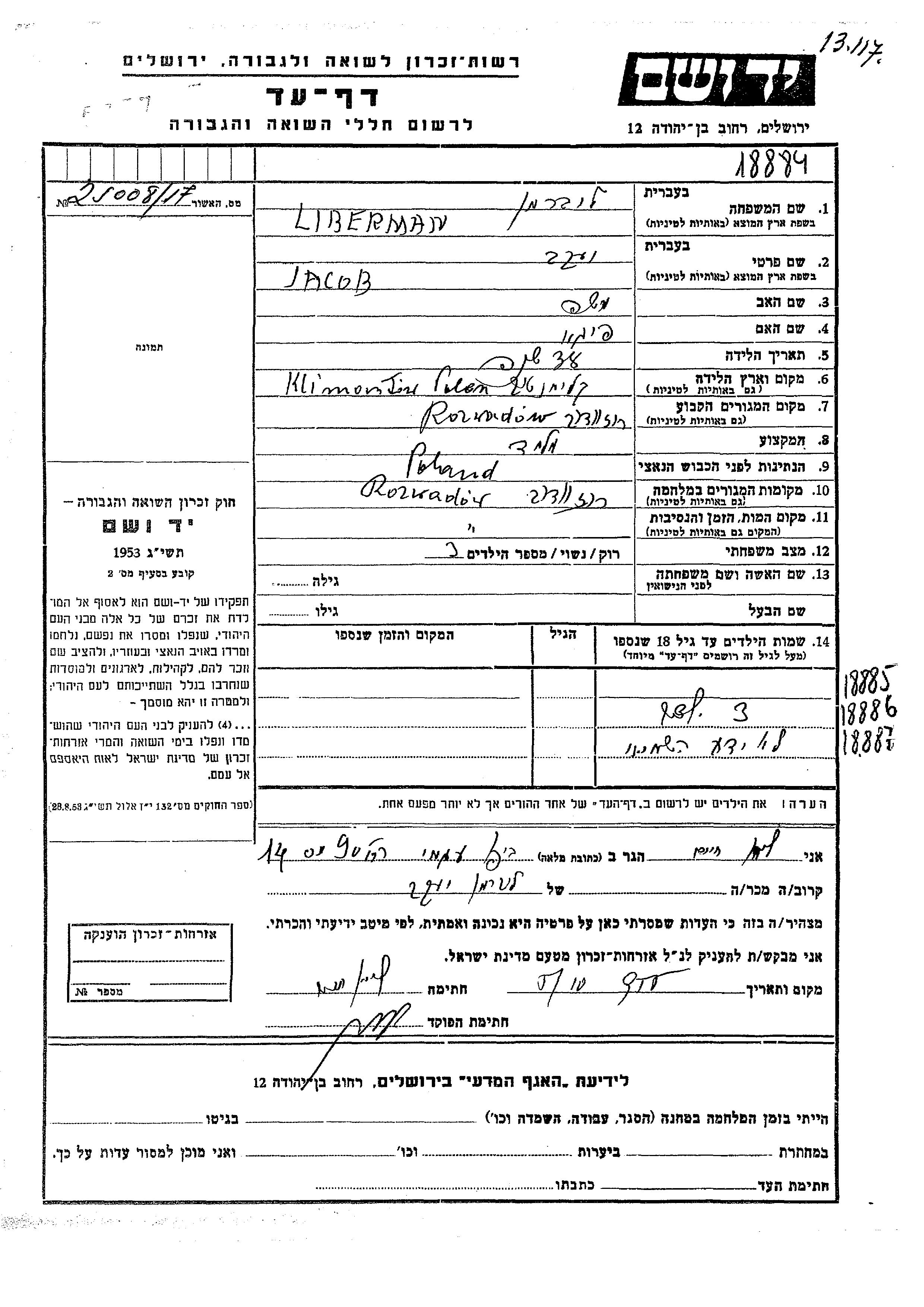 Jacob Liberman wurde in Klimontow, Polen geboren. Er war der Sohn von Moshe und Feiga. Er war Chederlehrer und Verheiratet. Vor dem Zweiten Weltkrieg lebte er in Rozwadów, Polen. Während des Krieges war er in Rozwadów, Polen.