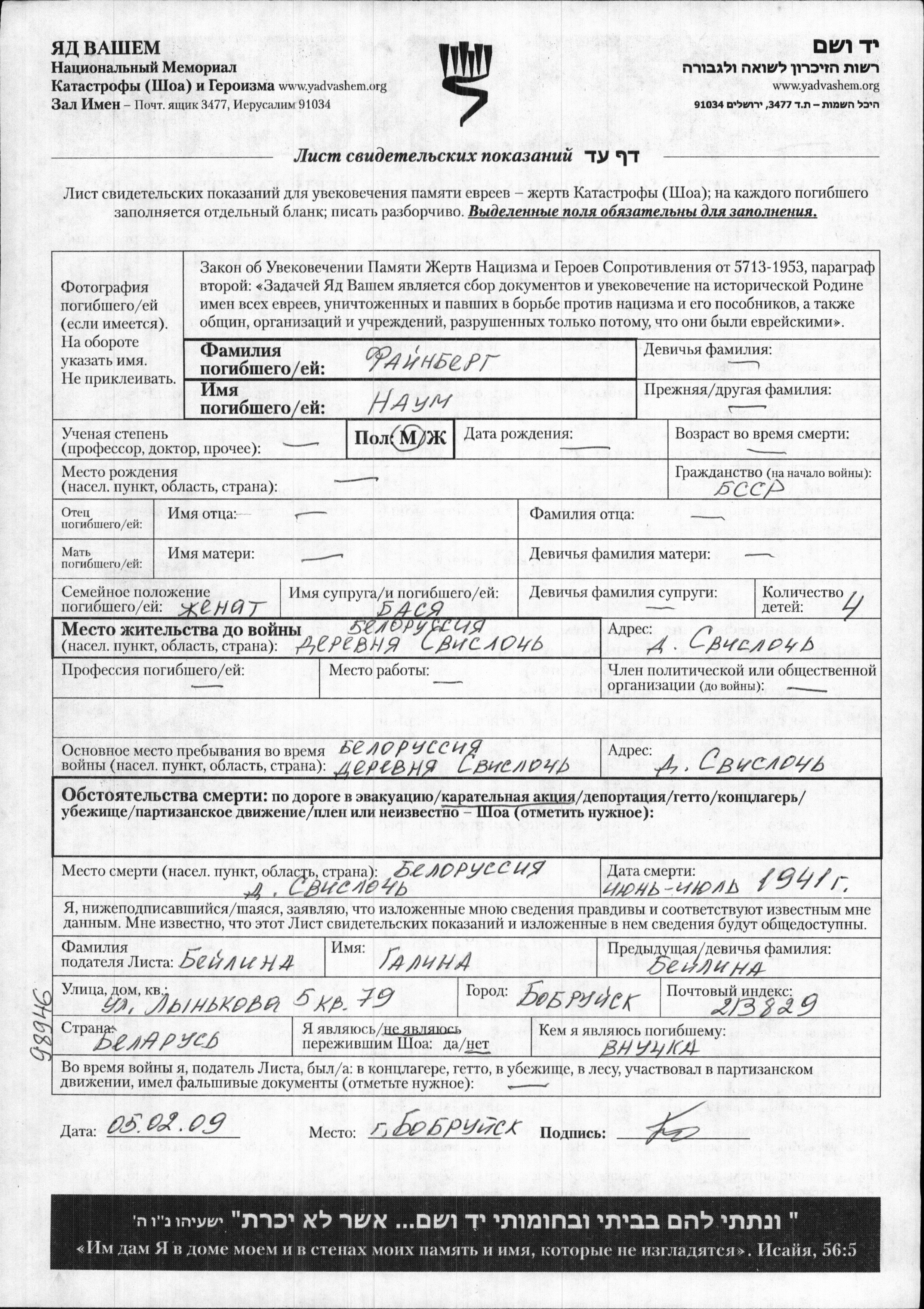 Naum Faynberg. Er war mit Basya Verheiratet. Vor dem Zweiten Weltkrieg lebte er in Svisloch, Weißrussland (UdSSR). Während des Krieges war er in Svisloch, Weißrussland (UdSSR).