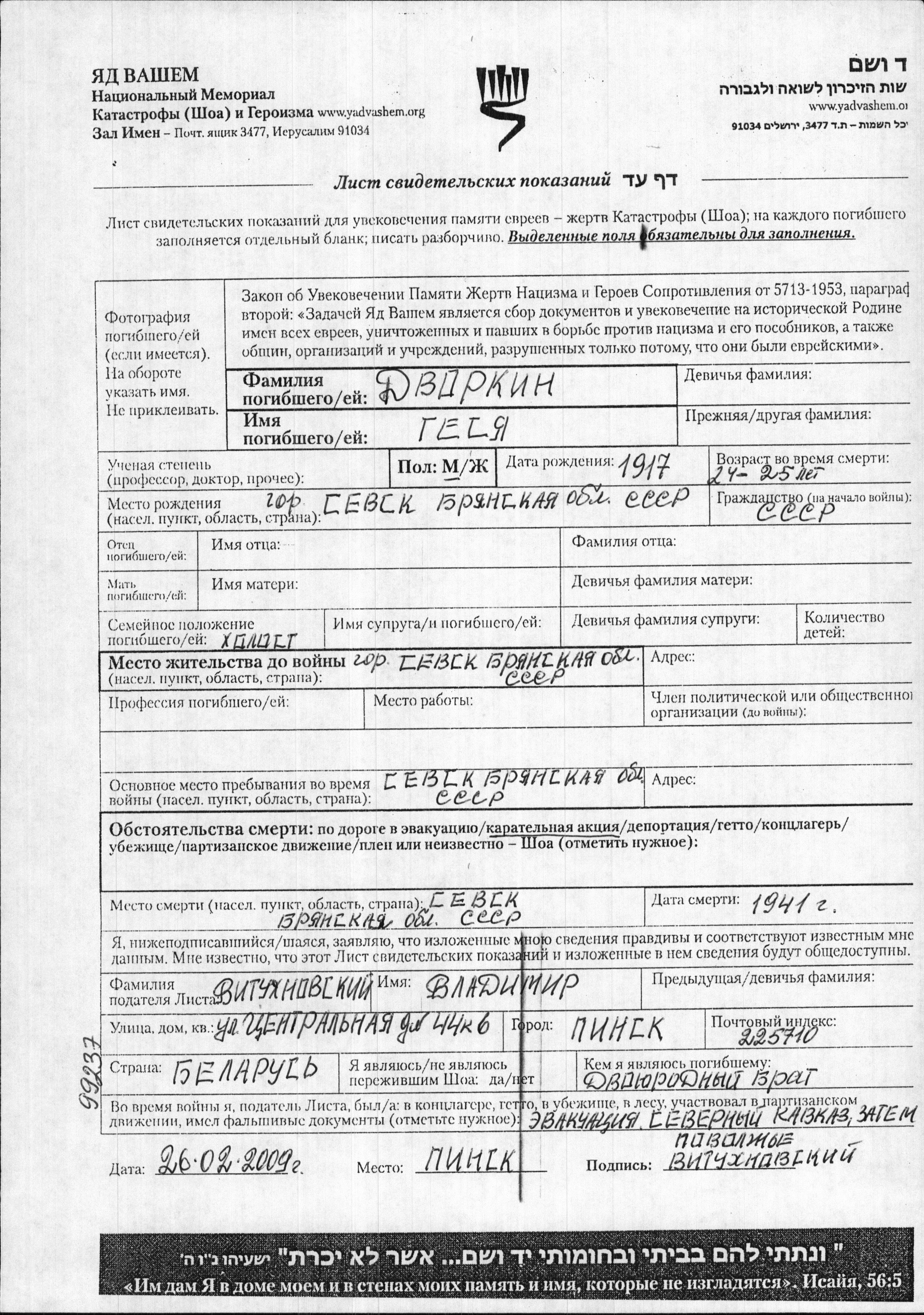Gesya Dvorkin wurde im Jahr 1917 in Sevsk, Russland (UdSSR) geboren. Er war Ledig. Vor dem Zweiten Weltkrieg lebte er in Sevsk, Russland (UdSSR). Während des Krieges war er in Sevsk, Russland (UdSSR).