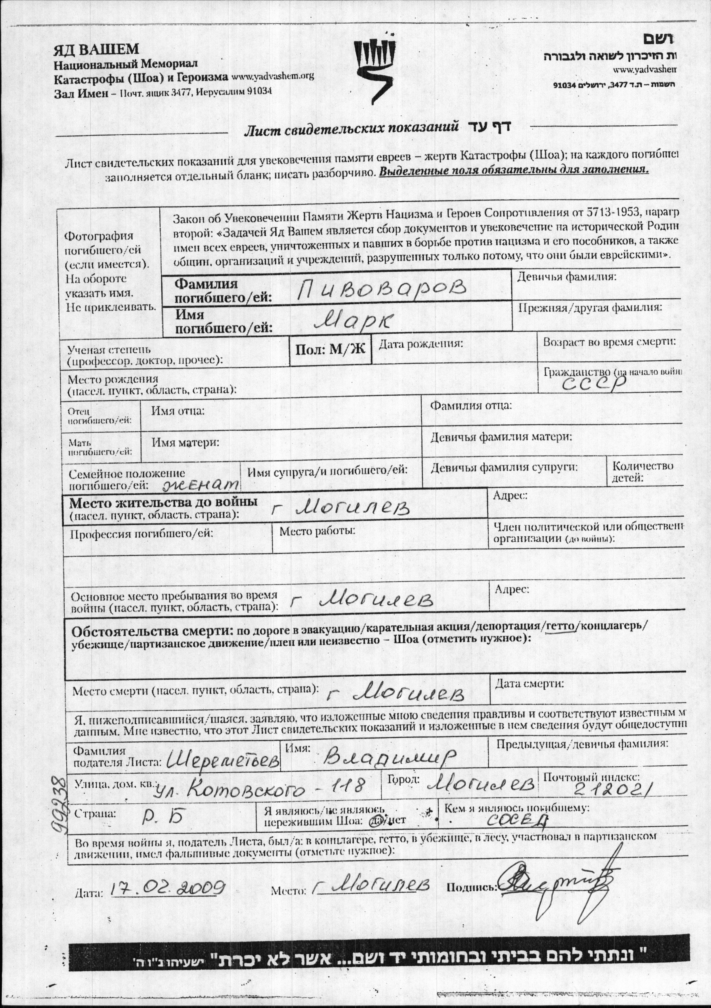 Mark Pivovarov. Er war Verheiratet. Vor dem Zweiten Weltkrieg lebte er in Mogilev, Weißrussland (UdSSR). Während des Krieges war er in Mogilev, Weißrussland (UdSSR).