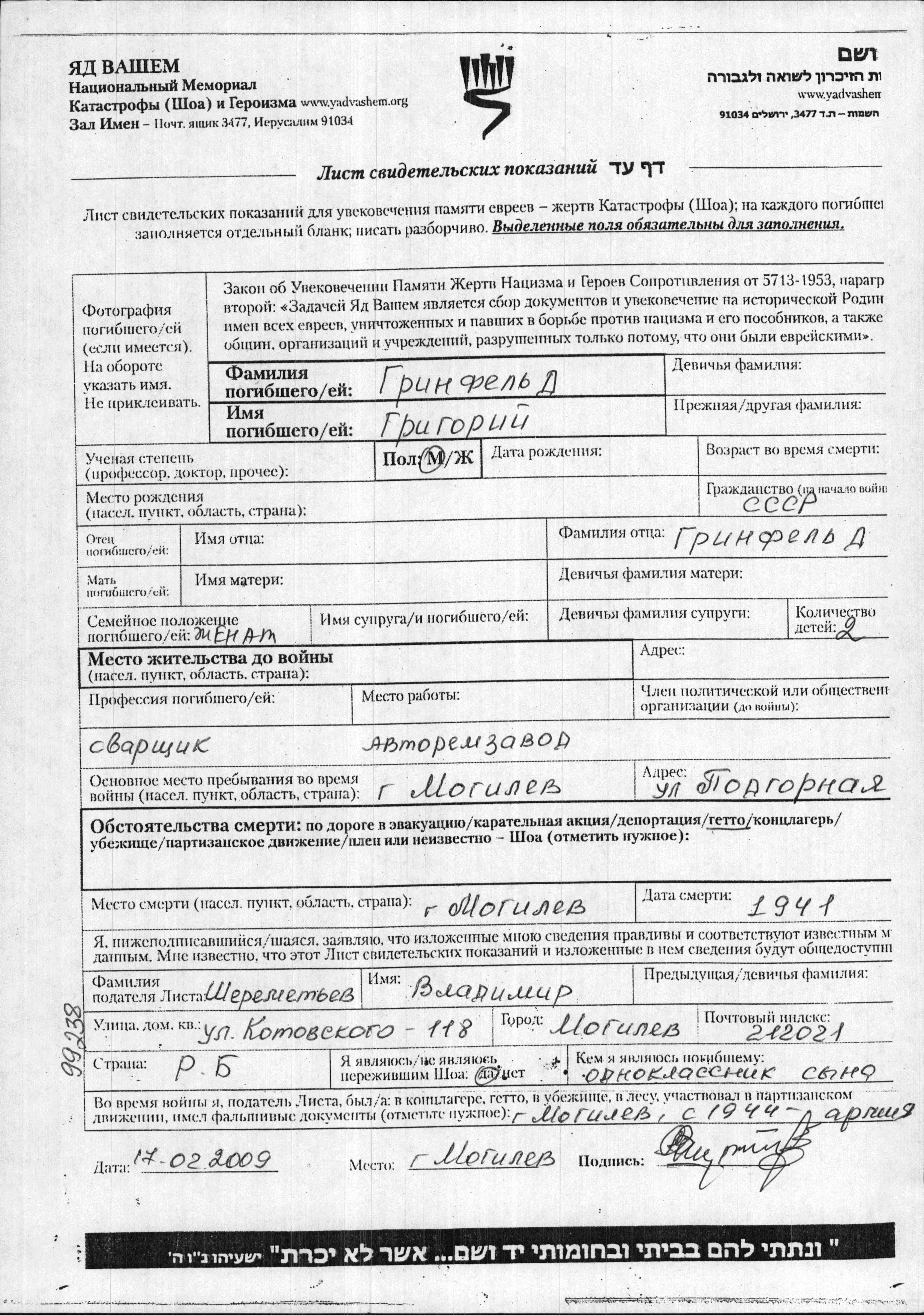 Grigoriy Grinfeld. Er war Svarshchik und Verheiratet. Vor dem Zweiten Weltkrieg lebte er in Mogilev, Weißrussland (UdSSR). Während des Krieges war er in Mogilev, Weißrussland (UdSSR).
