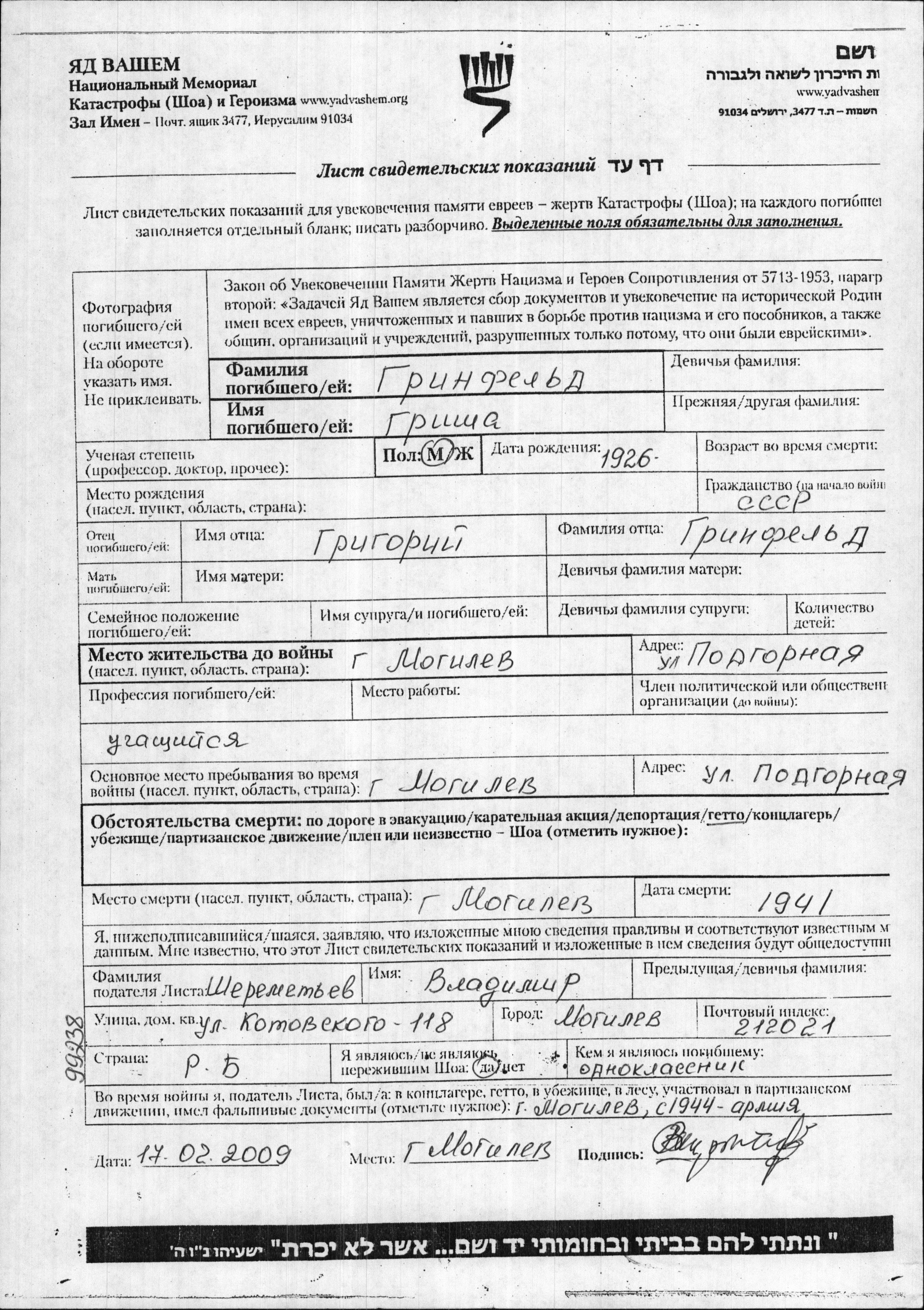 Grinfeld Grisha 1926 Mogilev, Weißrussland (UdSSR) Gedenkblatt