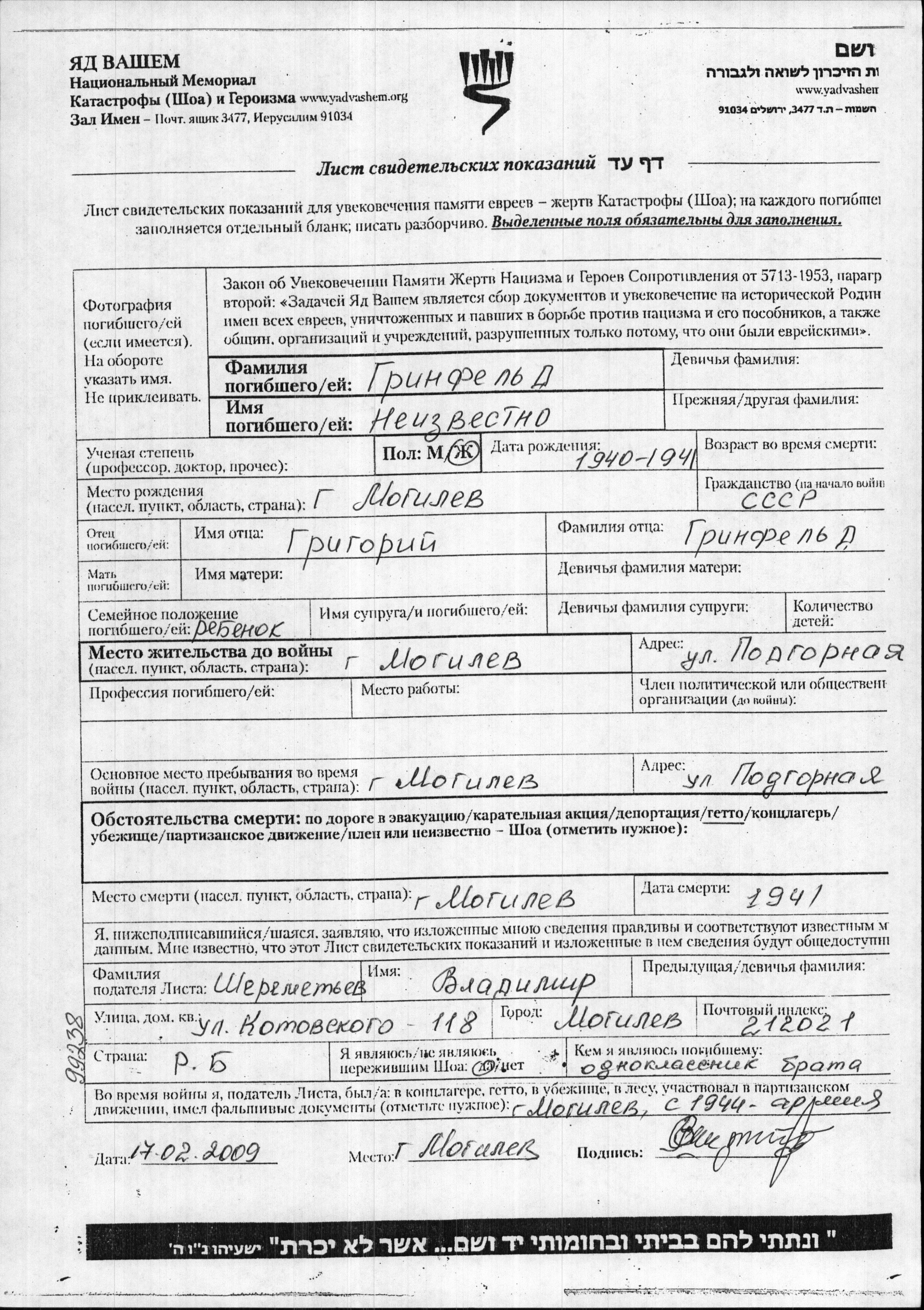Grinfeld Vorname unbekannt 1941 Mogilev, Weißrussland (UdSSR) Gedenkblatt