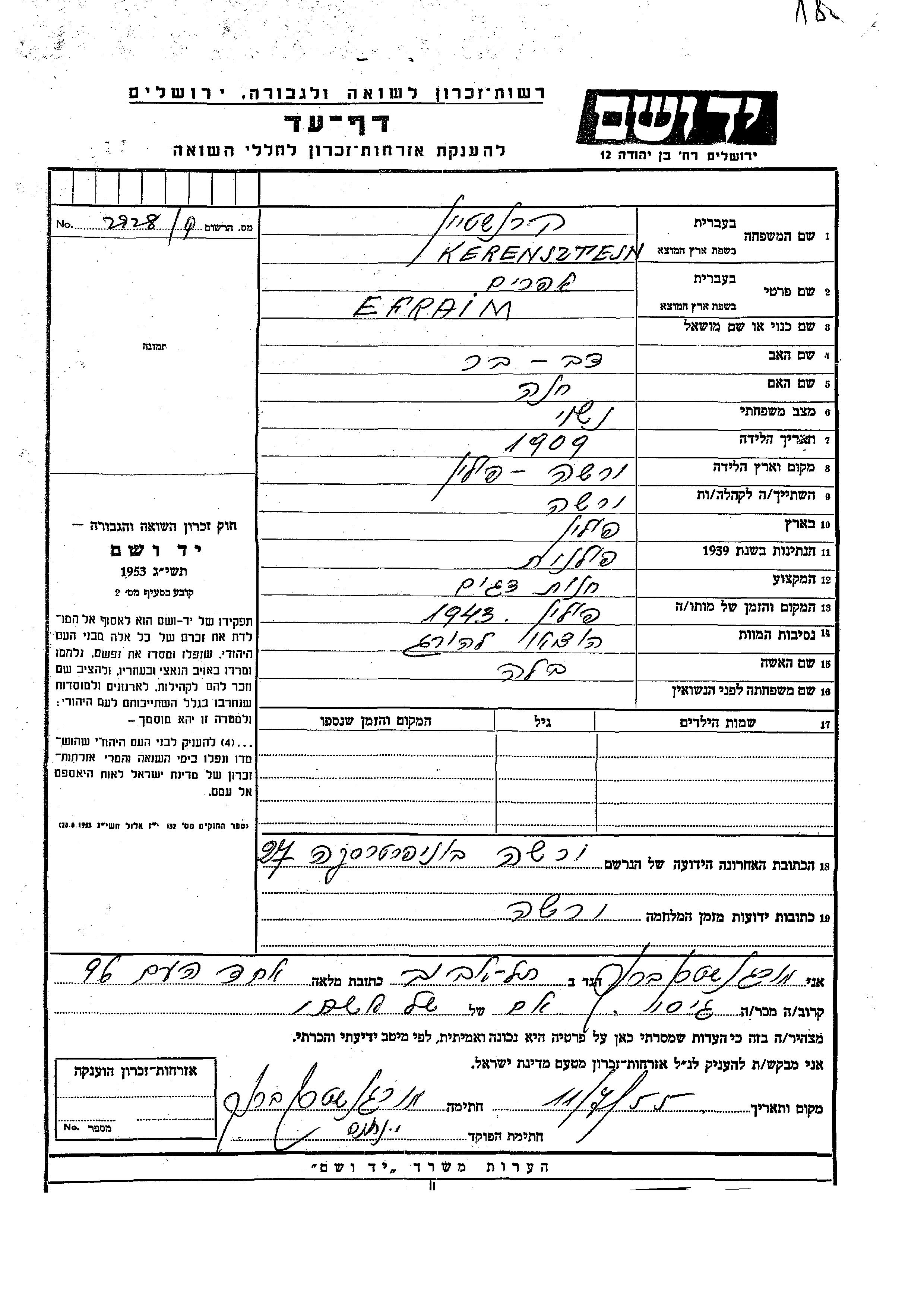 Kerensztejn Efraim 1909 Warszawa, Polen Gedenkblatt
