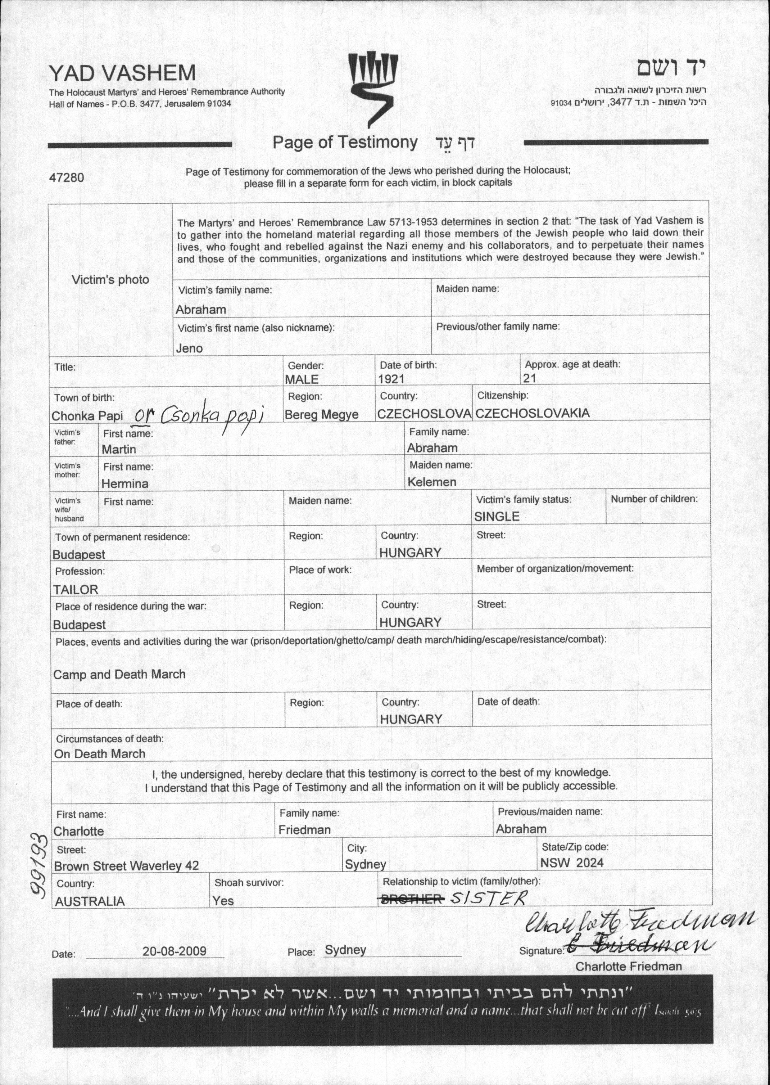 Jeno Abraham wurde im Jahr 1921 in Csonkapapi, Tschechoslowakei geboren. Er war der Sohn von Martin und Hermina, geb. Kelemen. Er war Schneider und Ledig. Vor dem Zweiten Weltkrieg lebte er in Budapest, Ungarn. Während des Krieges war er in Ungarn.