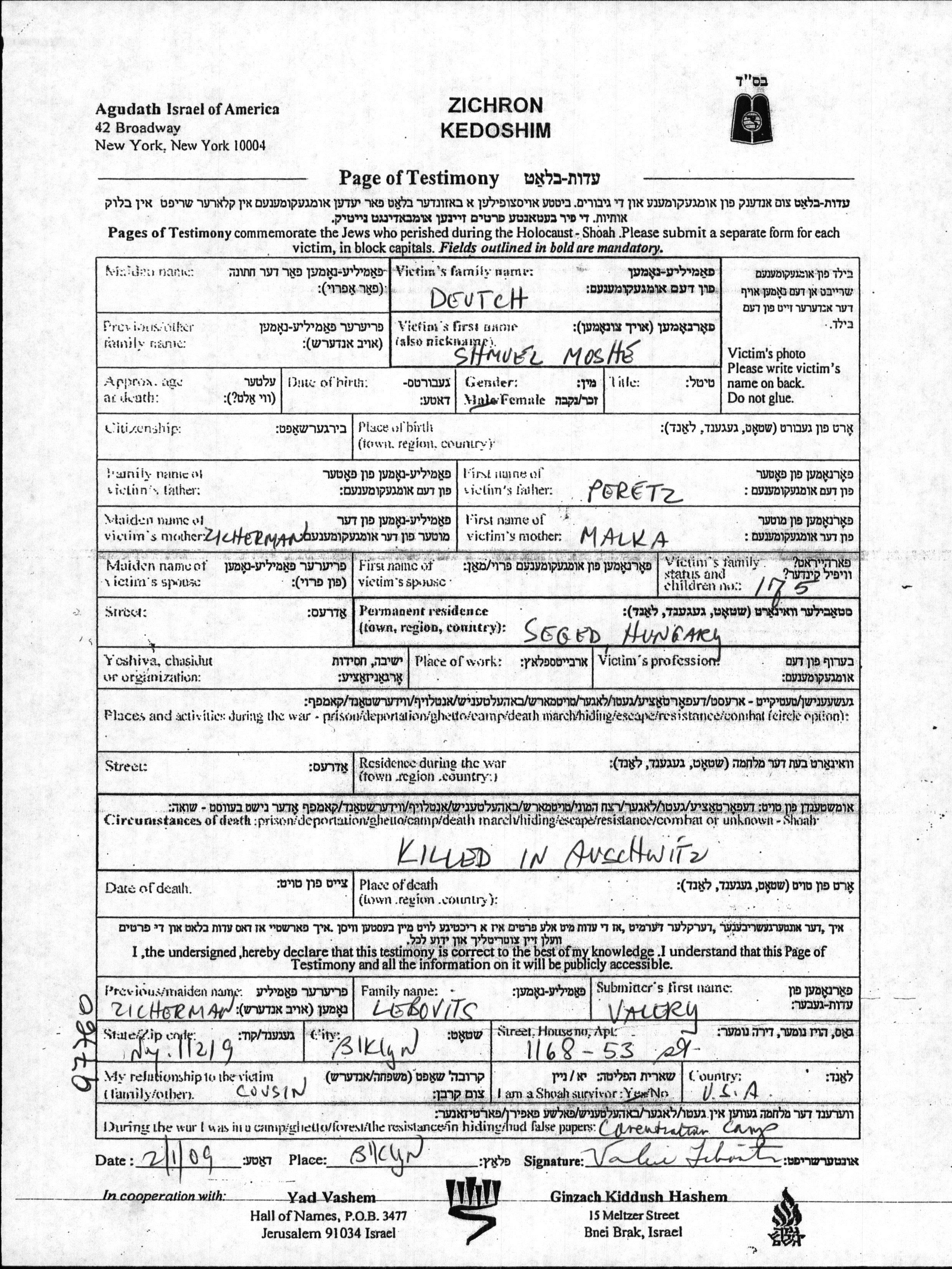 Shmuel Moshe Deutch wurde Er war der Sohn von Peretz und Malka, geb. Zicherman. Vor dem Zweiten Weltkrieg lebte er in Szeged, Ungarn.
