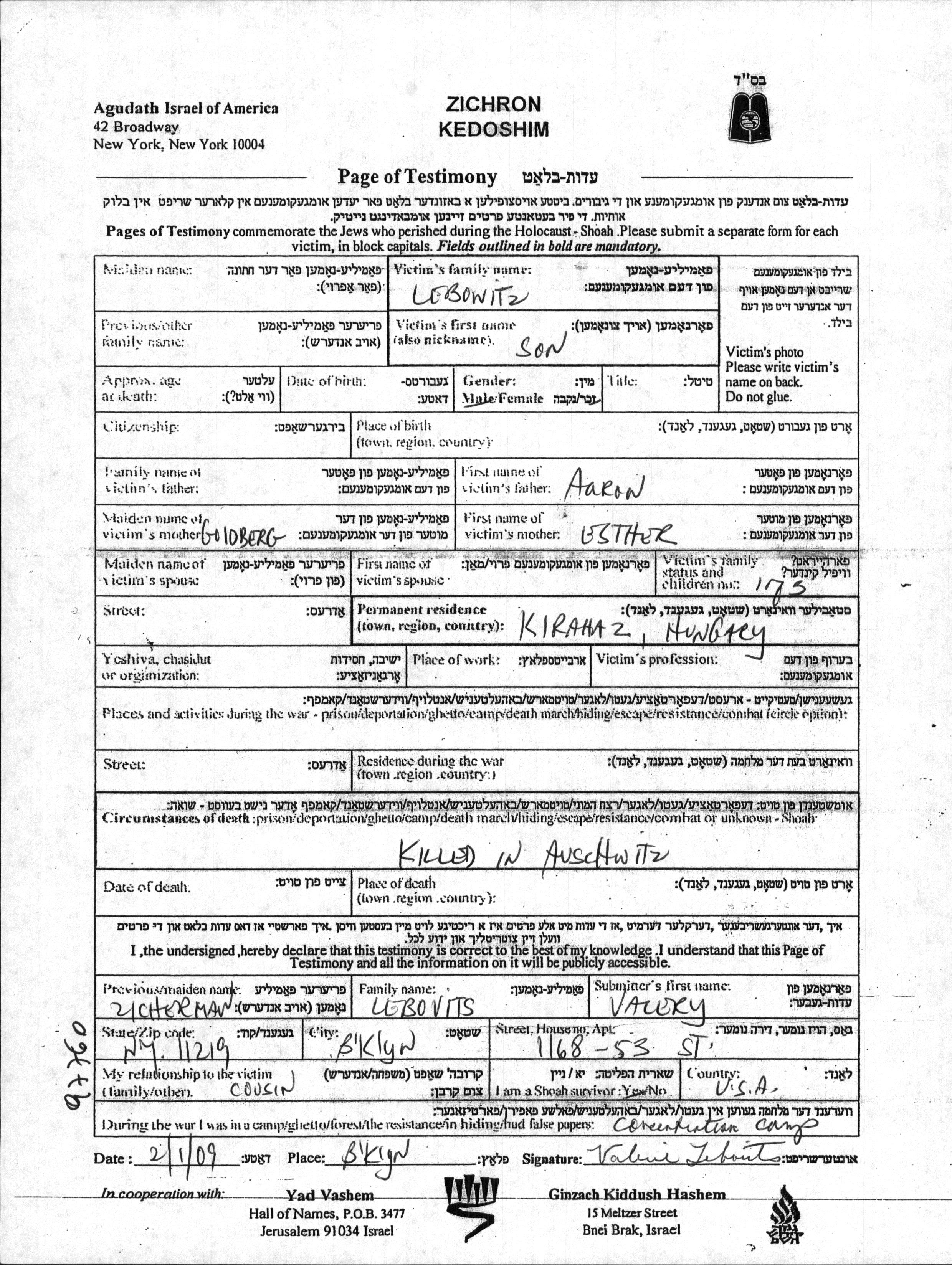 Vorname unbekannt Lebowitz wurde Er war der Sohn von Aaron und Esther, geb. Goldberg. Vor dem Zweiten Weltkrieg lebte er in Kirajhaza, Tschechoslowakei.