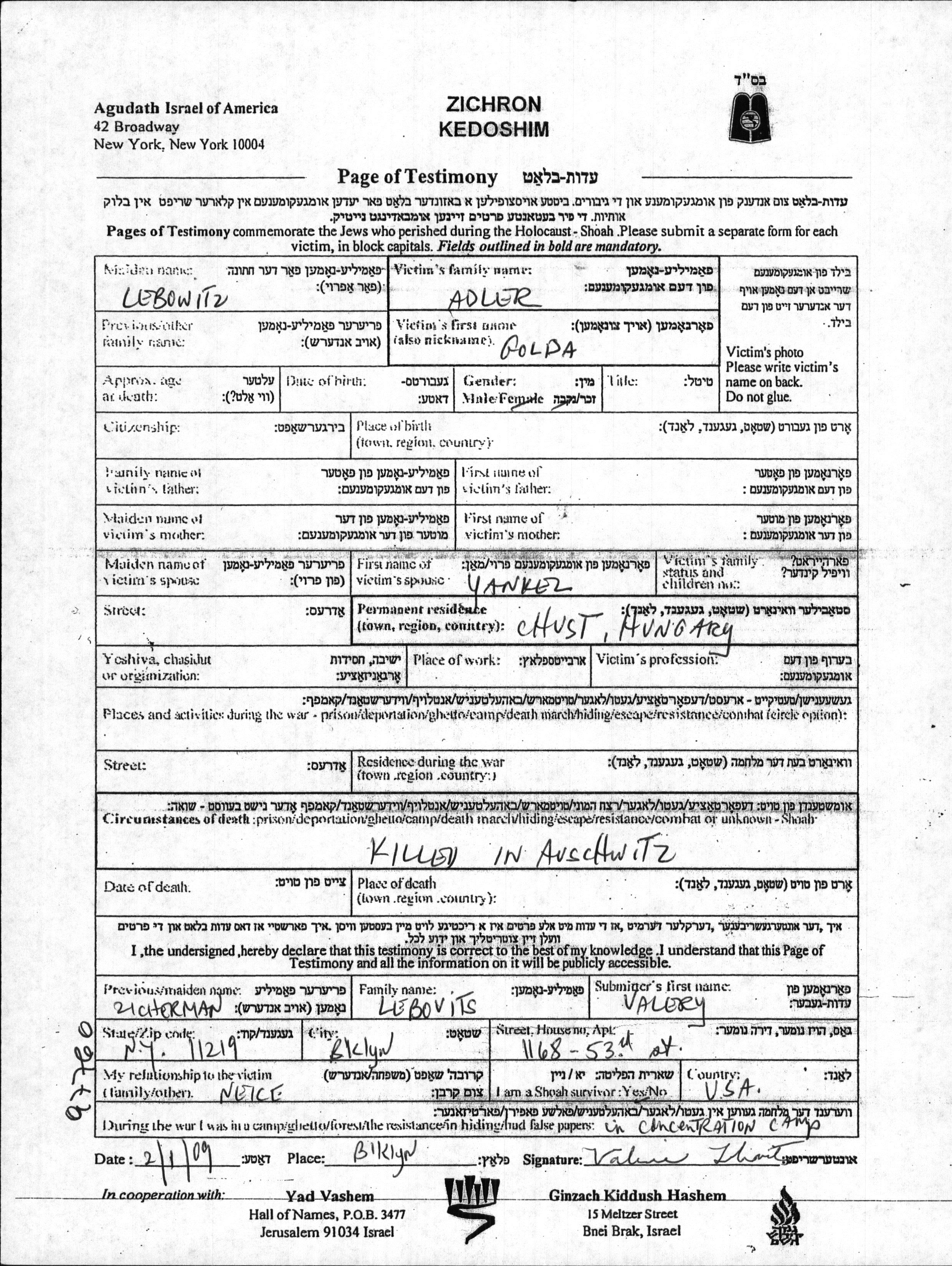 Golda Adler, geb. Lebowitz. Sie war mit Yankel Verheiratet. Vor dem Zweiten Weltkrieg lebte sie in Chust, Tschechoslowakei.
