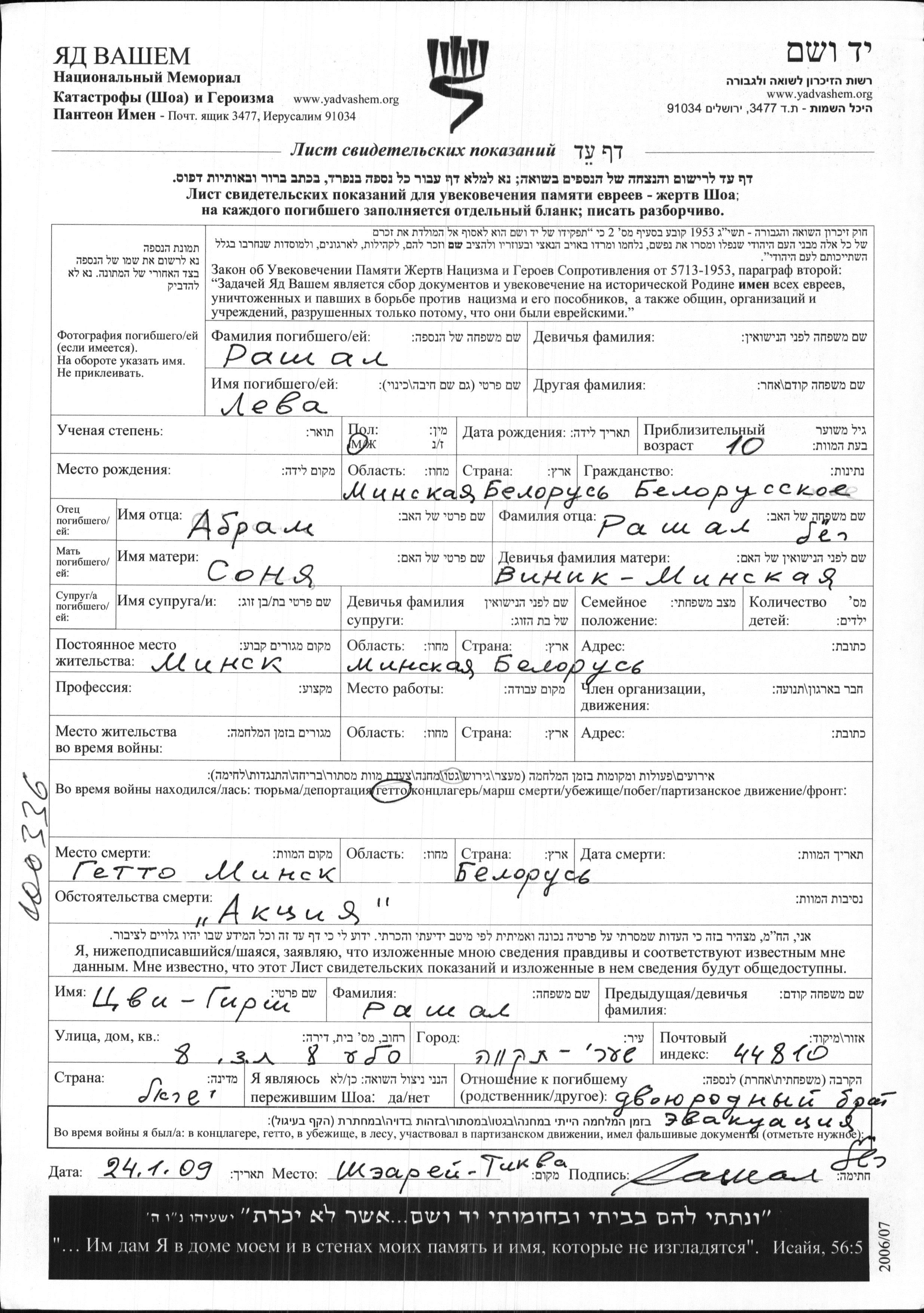 Leva Rashal wurde in Minsk, Weißrussland (UdSSR) geboren. Er war der Sohn von Abram und Sonya, geb. Vinik Minskaya. Er war Kind. Vor dem Zweiten Weltkrieg lebte er in Minsk, Weißrussland (UdSSR). Während des Krieges war er in Minsk, Weißrussland (UdSSR).
