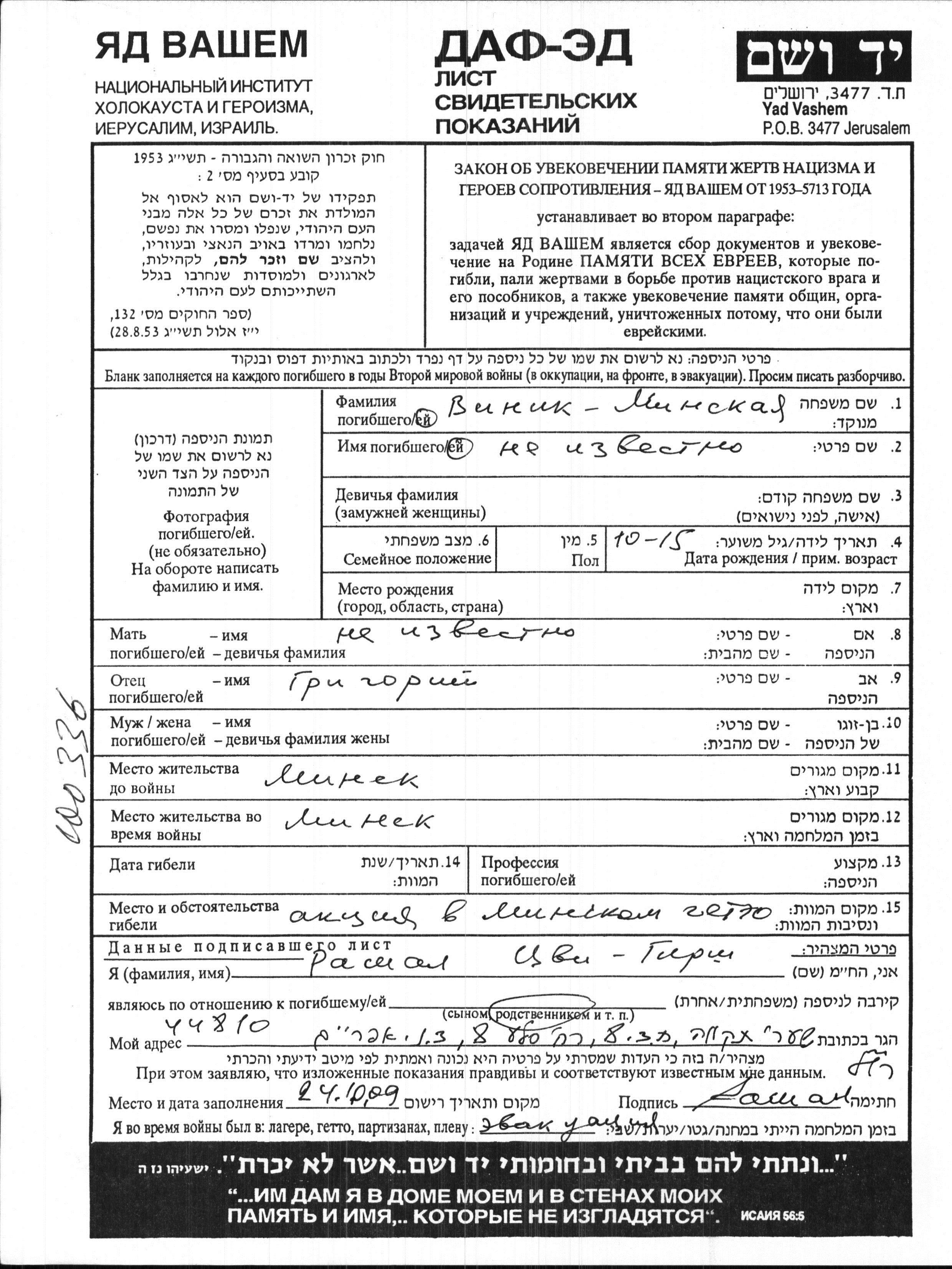 Vorname unbekannt Vinik Minskaya wurde Sie war die Tochter von Grigori. Sie war Kind. Vor dem Zweiten Weltkrieg lebte sie in Minsk, Weißrussland (UdSSR). Während des Krieges war sie in Minsk, Weißrussland (UdSSR).