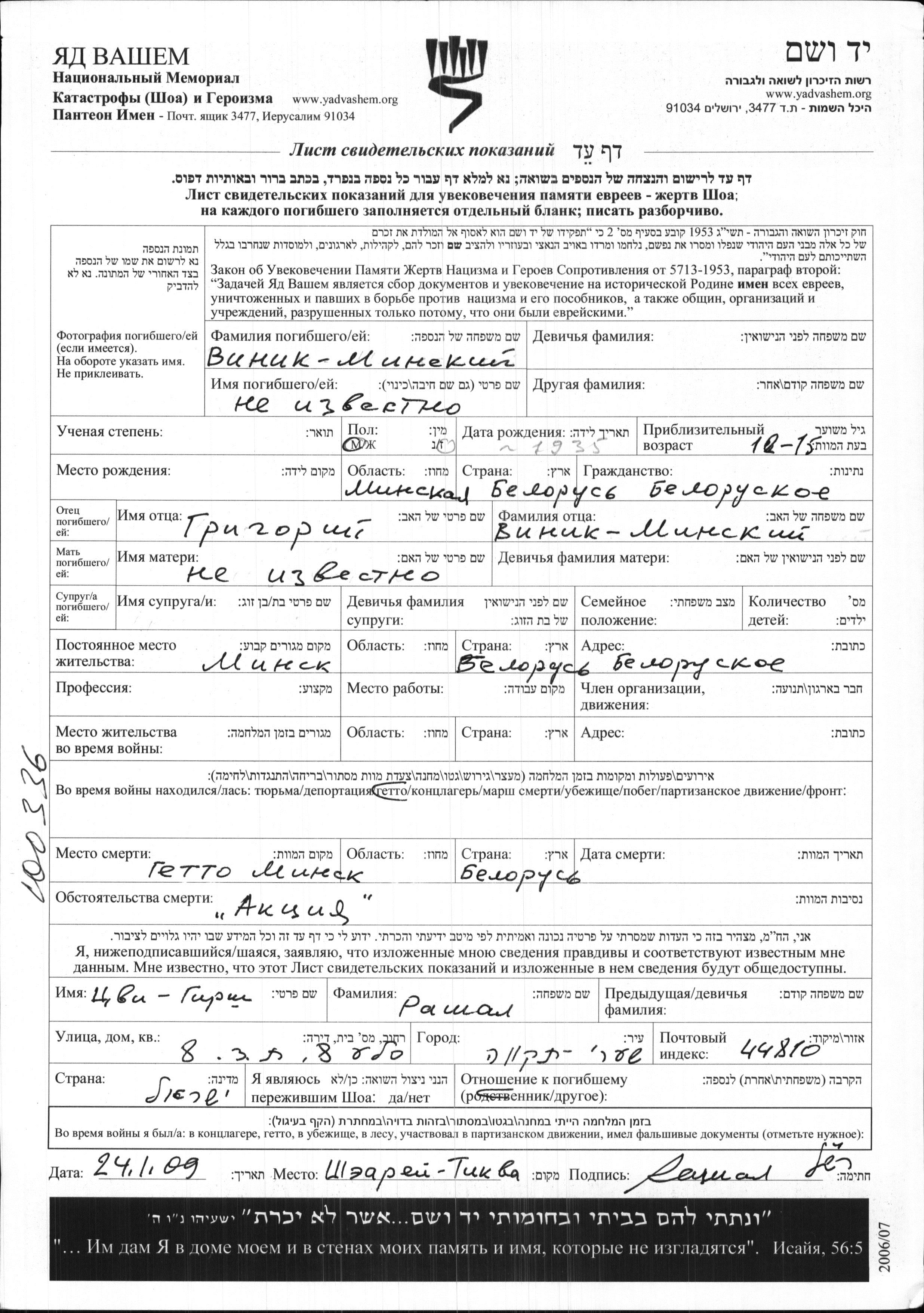 Vinik Minski Vorname unbekannt 1935 Minsk, Weißrussland (UdSSR) Gedenkblatt