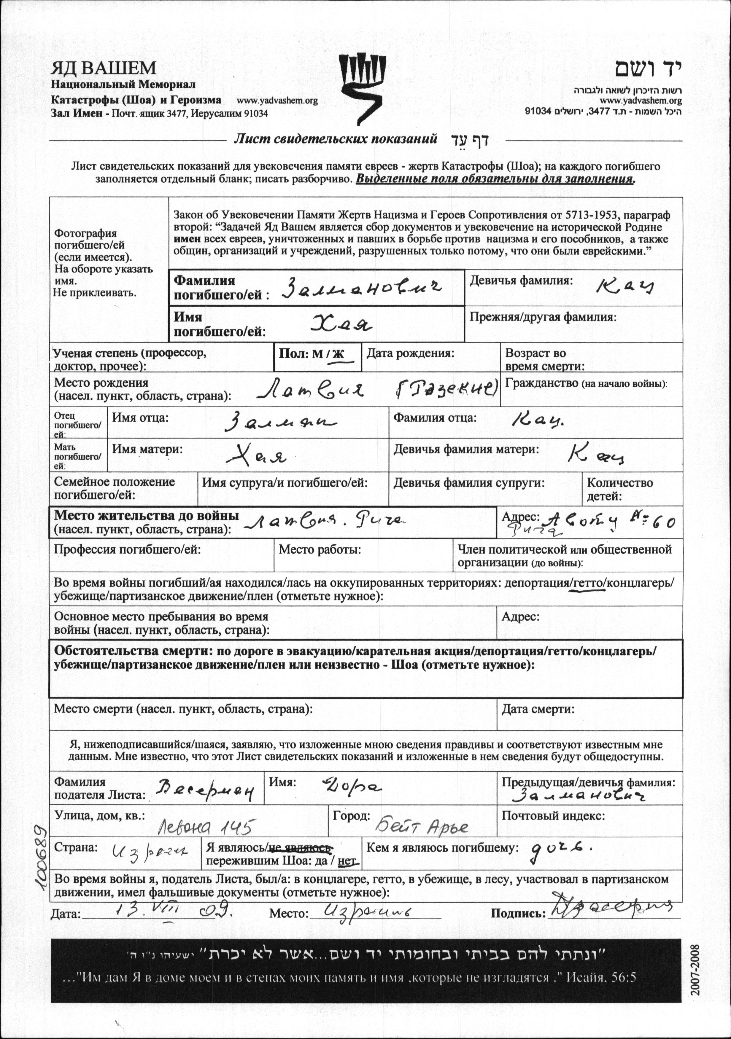 Zalmanovich Khaya Riga, Lettland Gedenkblatt