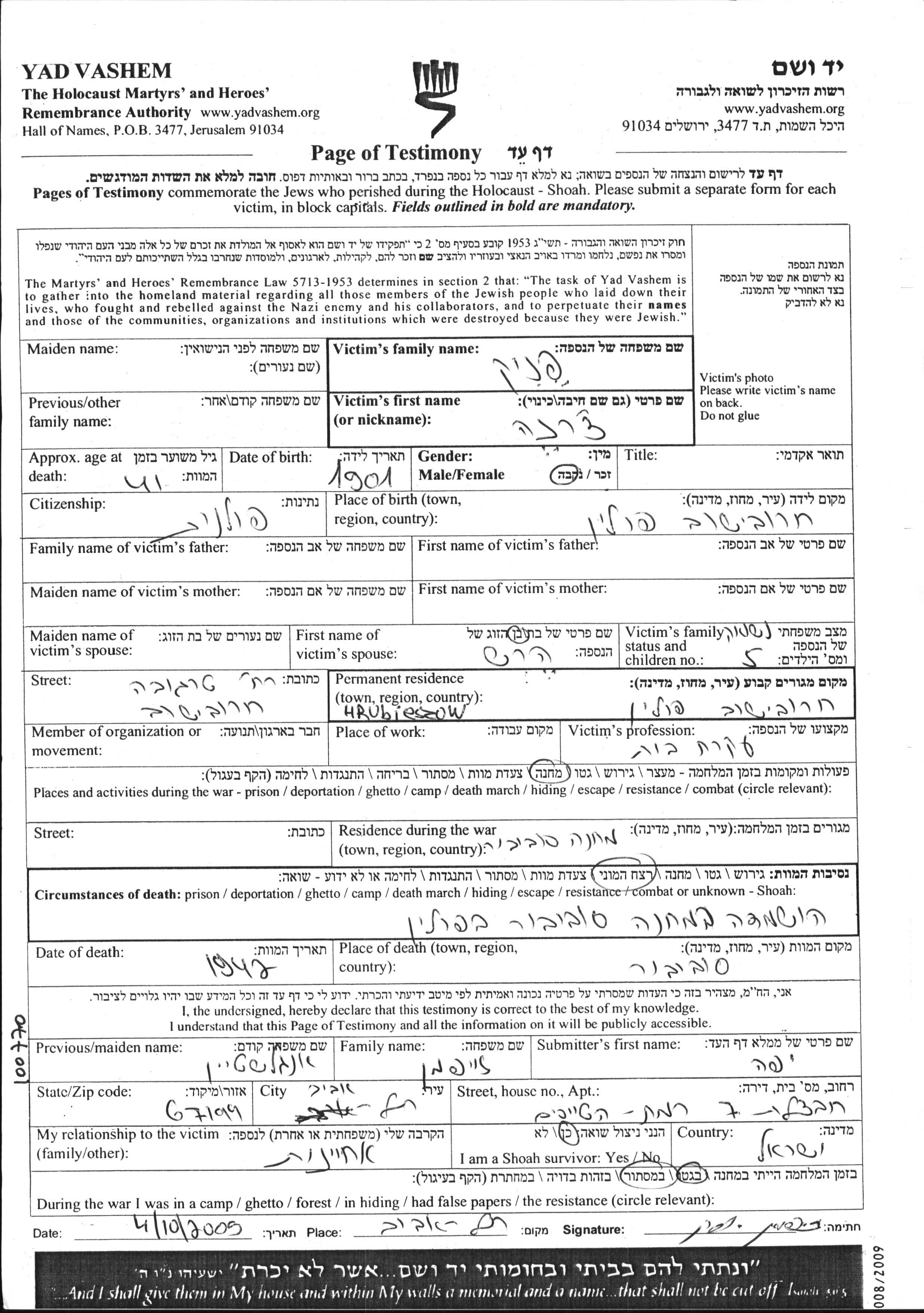 Zharna Penik wurde im Jahr 1901 in Hrubieszow, Polen geboren. Sie war Hausfrau und mit Hersh Verheiratet. Vor dem Zweiten Weltkrieg lebte sie in Hrubieszow, Polen.