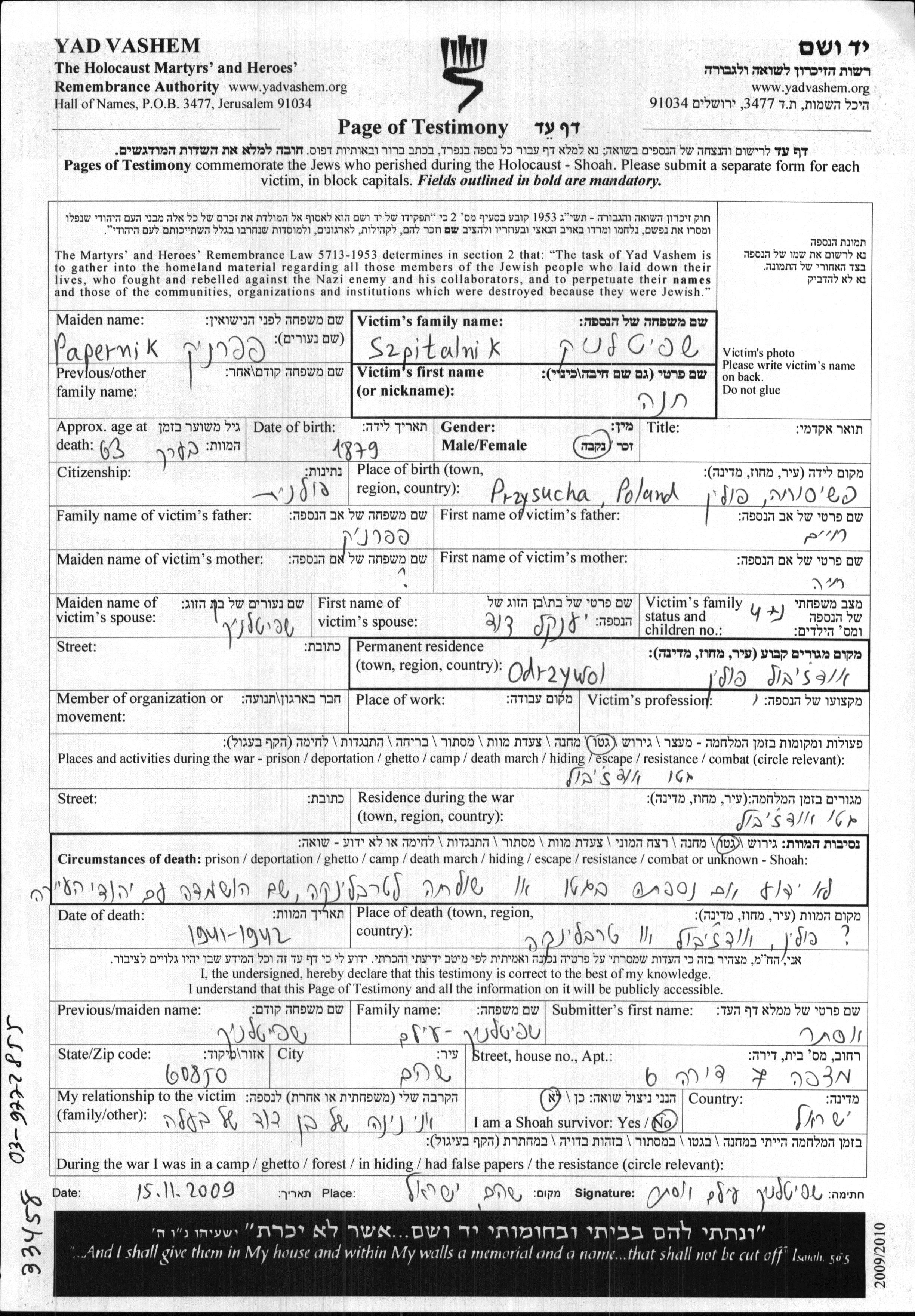 Khana Szpitalnik, geb. Papernik wurde im Jahr 1879 in Przysucha, Polen geboren. Sie war die Tochter von Chaim und Chaia. Sie war mit Yankel David Verheiratet. Vor dem Zweiten Weltkrieg lebte sie in Odrzywol, Polen. Während des Krieges war sie in Odrzywol, Polen.