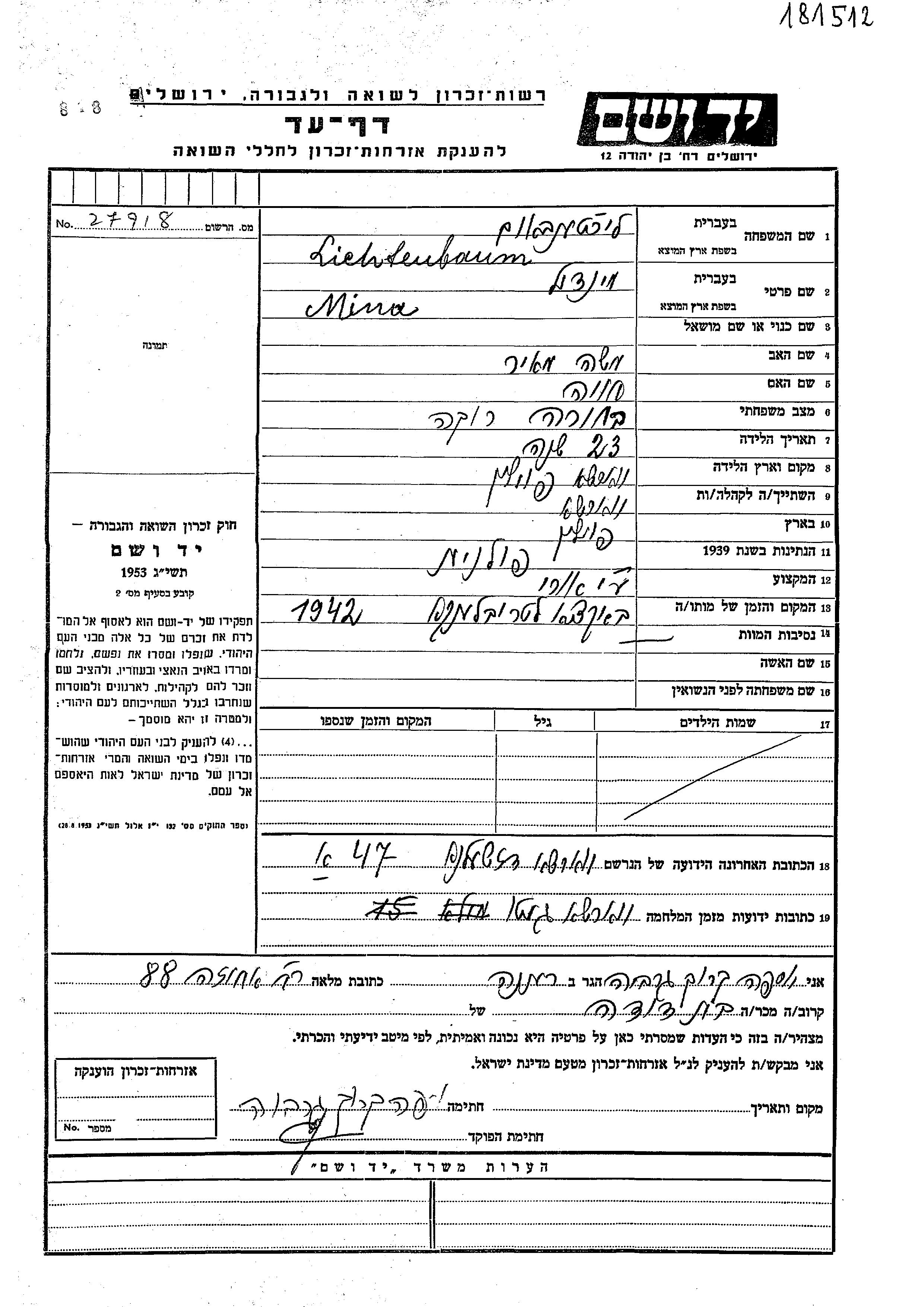 Mina Lichtenbaum wurde in Warsaw, Polen geboren. Sie war die Tochter von Moshe Meir und Eva. Sie war Ledig. Vor dem Zweiten Weltkrieg lebte sie in Warsaw, Polen. Während des Krieges war sie in Warsaw, Polen.