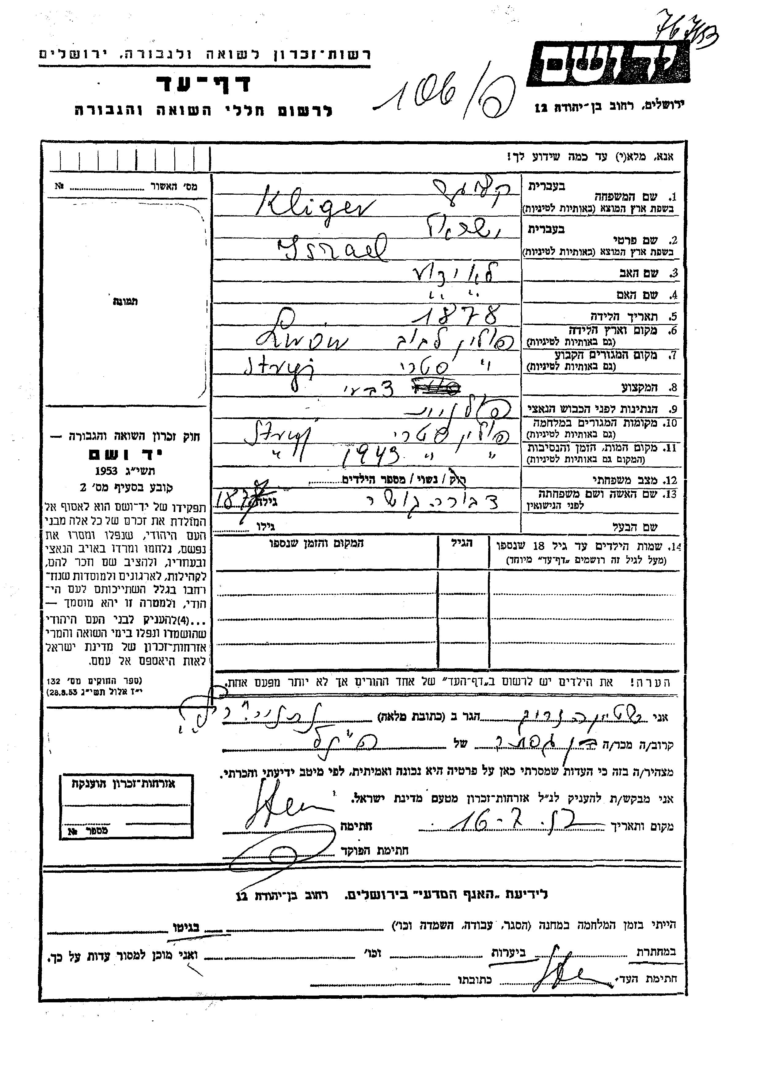 Israel Kliger wurde im Jahr 1878 in Lwow, Polen geboren. Er war Anstreicher/-in und mit Dvora, geb. Gosher Verheiratet. Vor dem Zweiten Weltkrieg lebte er in Stry, Polen. Während des Krieges war er in Stryj, Polen.