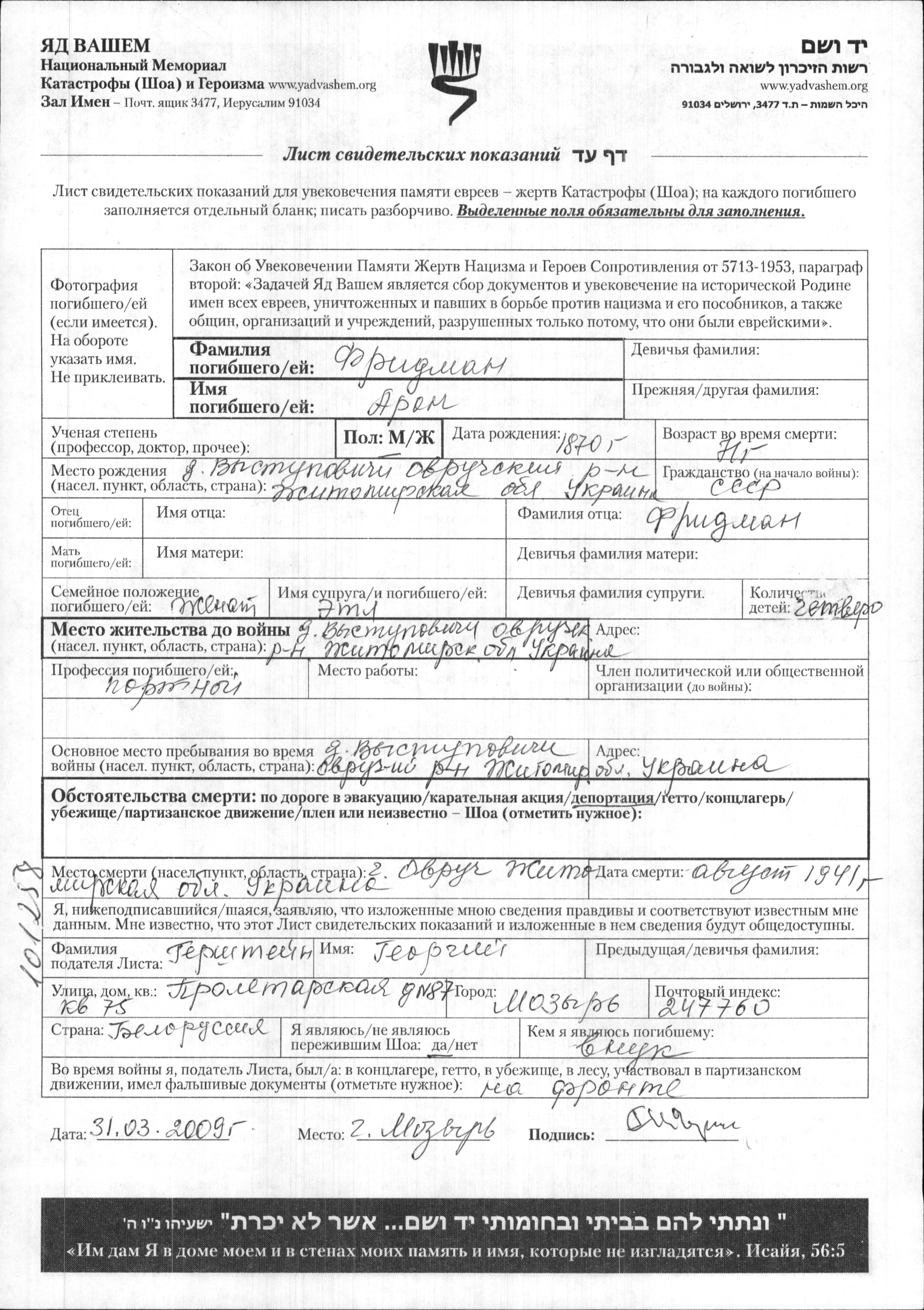Aron Fridman wurde im Jahr 1870 in Vystupovichi, Ukraine (UdSSR) geboren. Er war Schneider und mit Etl Verheiratet. Vor dem Zweiten Weltkrieg lebte er in Vystupovichi, Ukraine (UdSSR). Während des Krieges war er in Vystupovichi, Ukraine (UdSSR).