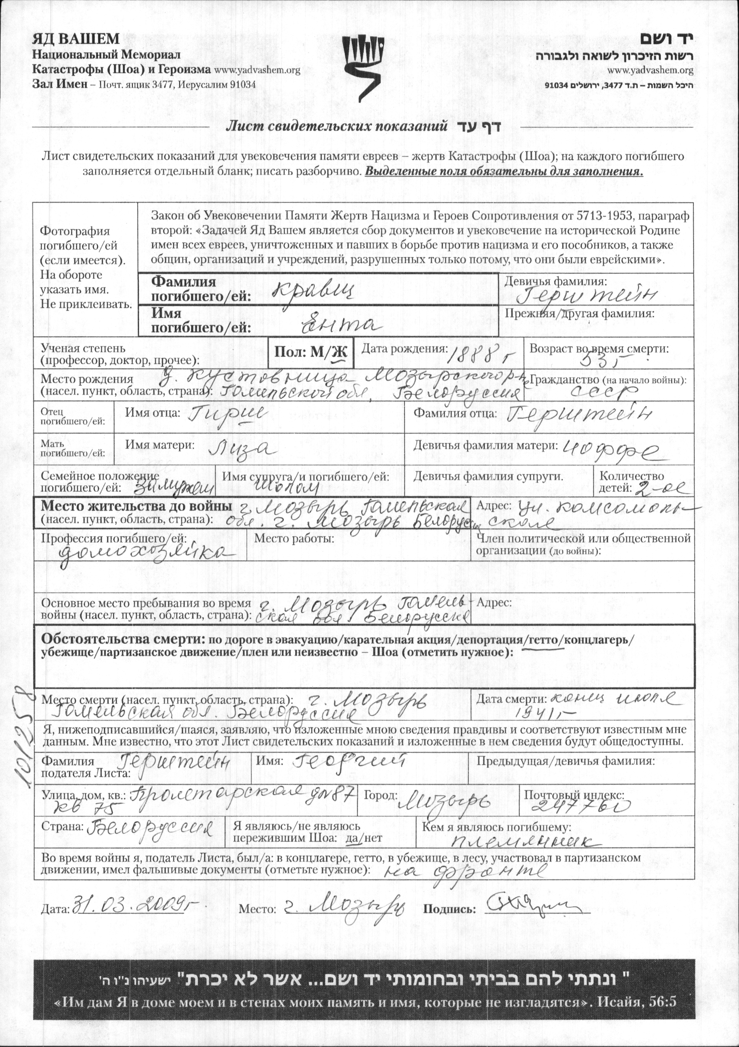 Yenta Kravetz, geb. Gershteyn wurde im Jahr 1888 in Kustovnitsa, Weißrussland (UdSSR) geboren. Sie war die Tochter von Girsh und Liza, geb. Ioffe. Sie war Hausfrau und mit Sholom Verheiratet. Vor dem Zweiten Weltkrieg lebte sie in Mozyr, Weißrussland (UdSSR). Während des Krieges war sie in Mozyr, Weißrussland (UdSSR).