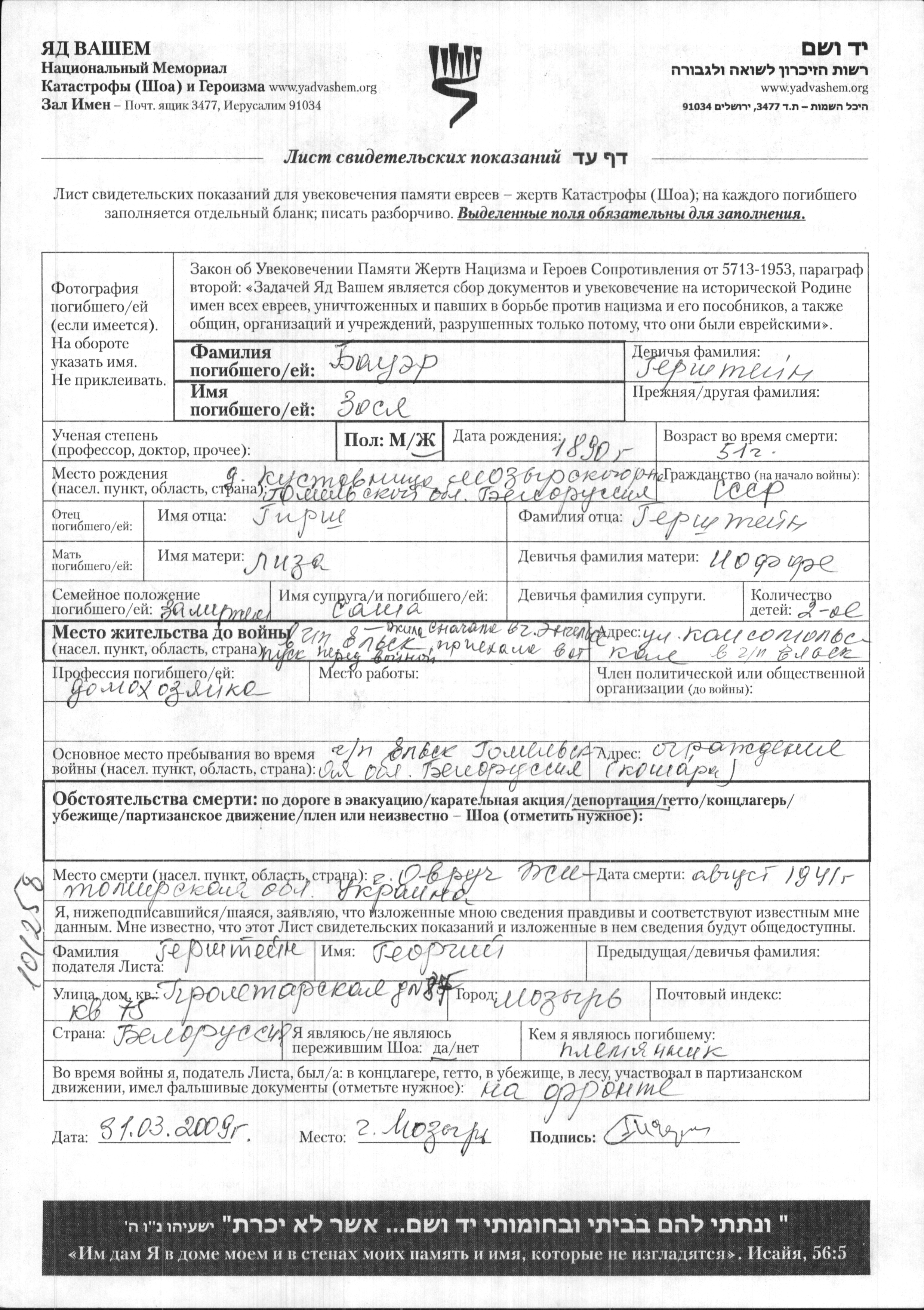 Zosya Bauer, geb. Gershtein wurde im Jahr 1890 in Kustovnitsa, Weißrussland (UdSSR) geboren. Sie war die Tochter von Girsh und Liza, geb. Ioffe. Sie war Hausfrau und mit Sasha Verheiratet. Vor dem Zweiten Weltkrieg lebte sie in Yelsk, Weißrussland (UdSSR). Während des Krieges war sie in Yelsk, Weißrussland (UdSSR).